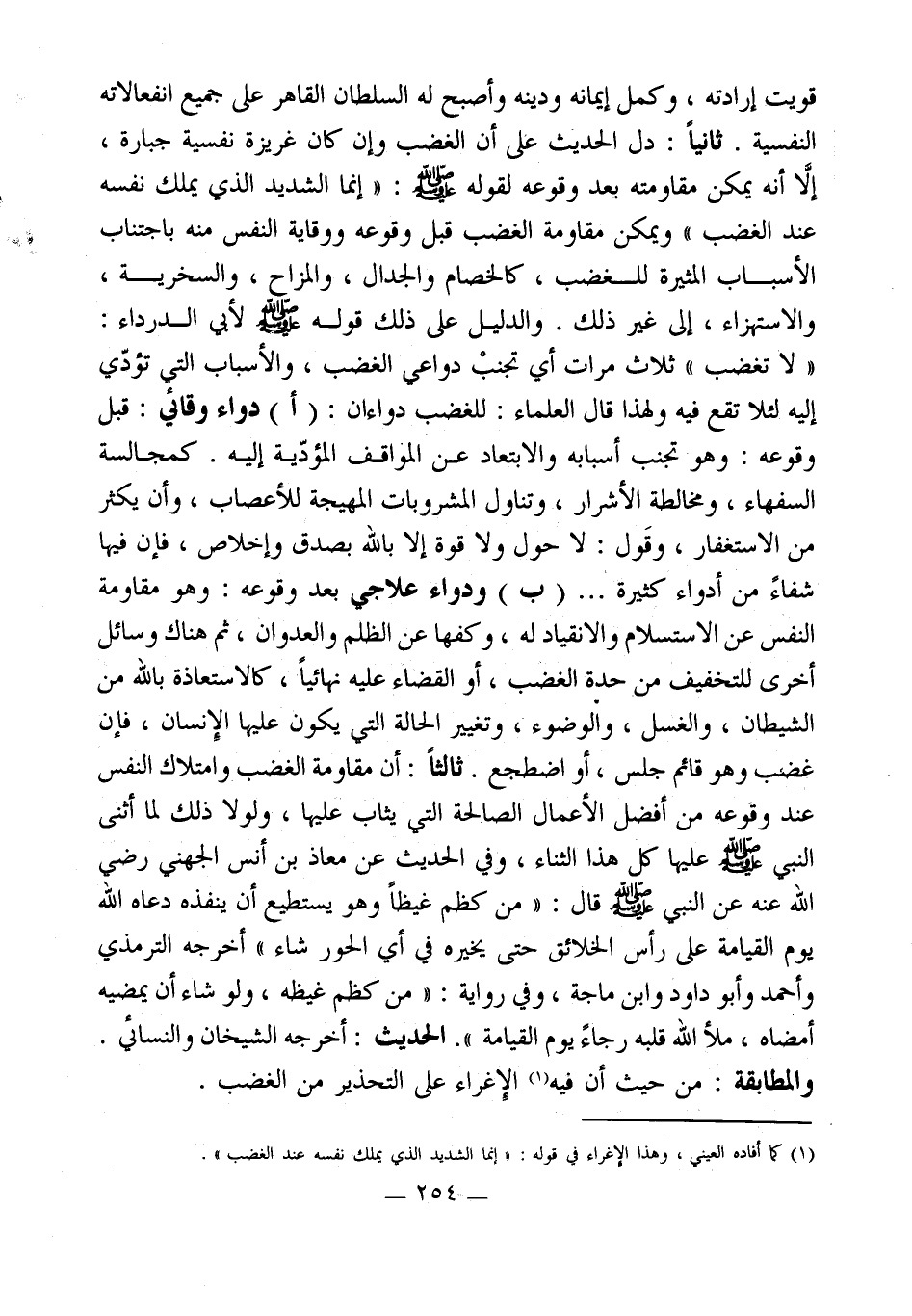 قويت إرادته، وكمل إيمانه ودينه وأصبح له السلطان القاهر على جميع انفعالاته النفسية. ثانياً: دل الحديث على أن الغضب وإن كان غريزة نفسية جبارة، إلَّا أنه يمكن مقاومته بعد وقوعه لقوله - صلى الله عليه وسلم -: " إنما الشديد الذي يملك نفسه عند الغضب " ويمكن مقاومة الغضب قبل وقوعه ووقاية النفس منه باجتناب الأسباب المثيرة للغضب، كالخصام والجدال، والمزاح، والسخرية، والاستهزاء، إلى غير ذلك. والدليل على ذلك قوله - صلى الله عليه وسلم - لأبي الدرداء: " لا تغضب " ثلاث مرات أي تجنب دواعي الغضب، والأسباب التي تؤدّي إليه لئلا تقع فيه ولهذا قال العلماء: للغضب دواءان: (أ) دواء وقائي: قبل وقوعه: وهو تجنب أسبابه والابتعاد عن المواقف المؤدّية إليه. كمجالسة السفهاء، ومخالطة الأشرار، وتناول المشروبات المهيجة للأعصاب، وأن يكثر من الاستغفار، وقَول: لا حول ولا قوة إلا بالله بصدق وإخلاص، فإن فيها شفاءً من أدواء كثيرة ... (ب) ودواء علاجي بعد وقوعه: وهو مقاومة النفس عن الاستسلام والانقياد له، وكفها عن الظلم والعدوان، ثم هناك وسائل أخرى للتخفيف من حدة الغضب، أو القضاء عليه نهائياً، كالاستعاذة بالله من الشيطان، والغسل، والوضوء، وتغيير الحالة التي يكون عليها الإِنسان، فإن غضب وهو قائم جلس، أو اضطجع. ثالثاً: أن مقاومة الغضب وامتلاك النفس عند وقوعه من أفضل الأعمال الصالحة التي يثاب عليها، ولولا ذلك لما أثنى النبي - صلى الله عليه وسلم - عليها كل هذا الثناء، وفي الحديث عن معاذ بن أنس الجهني رضي الله عنه عن النبي - صلى الله عليه وسلم - قال: " من كظم غيظاً وهو يستطيع أن ينفذه دعاه الله يوم القيامة على رأس الخلائق حتى يخيره في أي الحور شاء " أخرجه الترمذي وأحمد وأبو داود وابن ماجة، وفي رواية: " من كظم غيظه، ولو شاء أن يمضيه أمضاه، ملأ الله قلبه رجاءً يوم القيامة ". الحديث: أخرجه الشيخان والنسائي. والمطابقة: من حيث أن فيه (¬1) الإِغراء على التحذير من الغضب.
