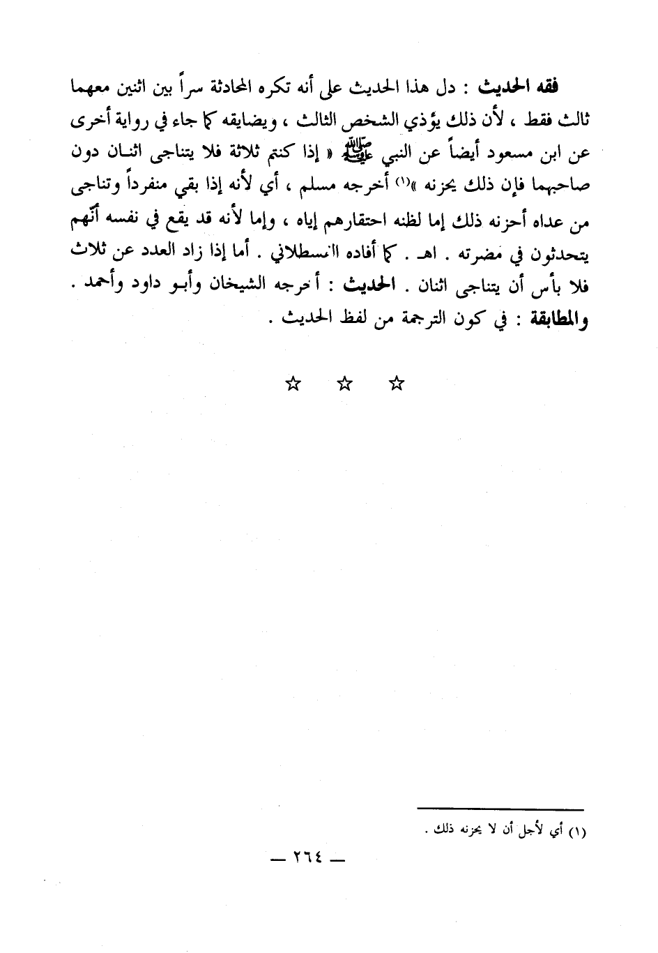 فقه الحديث: دل هذا الحديث على أنه تكره المحادثة سراً بين اثنين معهما ثالث فقط، لأن ذلك يؤذى الشخص الثالث، ويضايقه كما جاء في رواية أخرى عن ابن مسعود أيضاً عن النبي أيضاً " إذا كنتم ثلاثة فلا يتناجى اثنان دون صاحبهما فإن ذلك يحزنه " (¬1) أخرجه مسلم، أي لأنه إذا بقي منفرداً وتناجى من عداه أحزنه ذلك إما لظنه احتقارهم إياه، وإما لأنه قد يقع في نفسه أنّهم يتحدثون في مضرته. اهـ. كما أفاده القسطلاني. أما إذا زاد العدد عن ثلاث فلا بأس أن يتناجى اثنان. الحديث: أخرجه الشيخان وأبو داود وأحمد. والمطابقة: في كون الترجمة من لفظ الحديث.