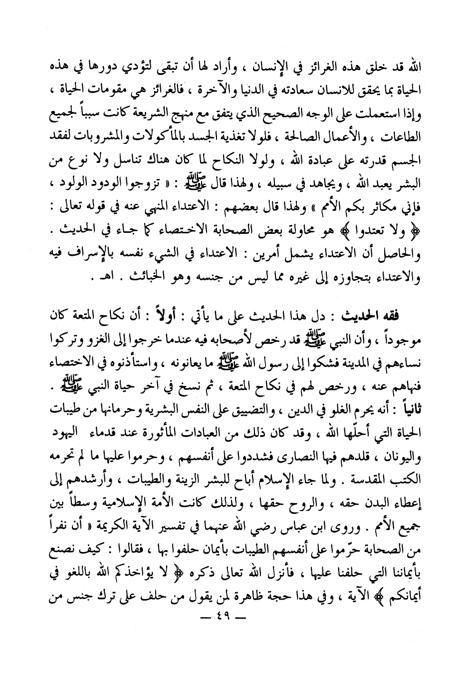 فقه الحديث: دل هذا الحديث على ما يأتي: أولاً: أن نكاح المتعة كان موجوداً، وأن النبي - صلى الله عليه وسلم - قد رخص لأصحابه فيه عندما خرجوا إلى الغزو وتركوا نساءهم في المدينة فشكوا إلى رسول الله - صلى الله عليه وسلم - ما يعانونه، واستأذنوه في الاختصاء فنهاهم عنه، ورخص لهم في نكاح المتعة، ثم نسخ في آخر حياة النبي - صلى الله عليه وسلم -. ثانياً: أنه يحرم الغلو في الدين، والتضييق على النفس البشرية وحرمانها من طيبات الحياة التي أحلّها الله، وقد كان ذلك من العبادات المأثورة عند قدماء اليهود واليونان، قلدهم فيها النصارى فشددوا على أنفسهم، وحرموا عليها ما لم تحرمه الكتب المقدسة. ولما جاء الإِسلام أباح للبشر الزينة والطيبات، وأرشدهم إلى إعطاء البدن حقه، والروح حقها، ولذلك كانت الأمة الإسلامية وسطاً بين جميع الأمم. وروى ابن عباس رضي الله عنهما في تفسير الآية الكريمة " أن نفراً من الصحابة حرّموا على أنفسهم الطيبات بأيمان حلفوا بها، فقالوا: كيف نصنع بأيماننا التي حلفنا عليها، فأنزل الله تعالى ذكره (لَا يُؤَاخِذُكُمُ اللَّهُ بِاللَّغْوِ فِي أَيْمَانِكُمْ) الآية، وفي هذا حجة ظاهرة لمن يقول من حلف على ترك جنس من
