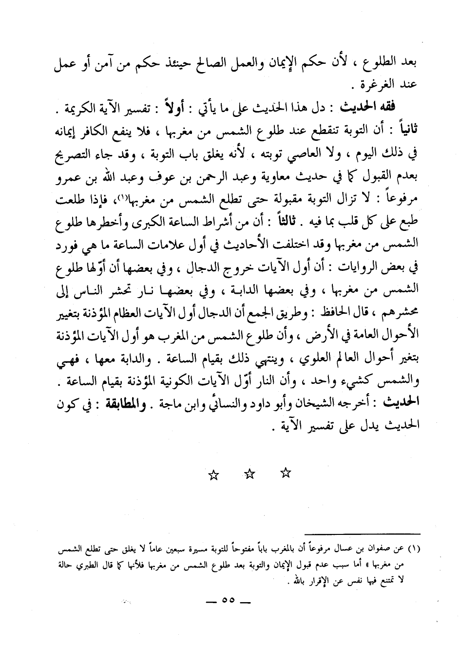 فقه الحديث: دل هذا الحديث على ما يأتي: أولاً: تفسير الآية الكريمة. ثانياًً: أن التوبة تنقطع عند طلوع الشمس من مغربها، فلا ينفع الكافر إيمانه في ذلك اليوم، ولا العاصي توبته، لأنه يغلق باب التوبة، وقد جاء التصريح بعدم القبول كما في حديث معاوية وعبد الرحمن بن عوف وعبد الله بن عمرو مرفوعاً: لا تزال التوبة مقبولة حتى تطلع الشمس من مغربها (¬1)، فإذا طلعت طبع على كل قلب بما فيه. ثالثاً: أن من أشراط الساعة الكبرى وأخطرها طلوع الشمس من مغربها وقد اختلفت الأحاديث في أول علامات الساعة ما هي فورد في بعض الروايات: أن أول الآيات خروج الدجال، وفي بعضها أن أوّلها طلوع الشمس من مغربها، وفي بعضها الدابة، وفي بعضها نار تحشر الناس إلى محشرهم، قال الحافظ: وطريق الجمع أن الدجال أول الآيات العظام المؤذنة بتغيير الأحوال العامة في الأرض، وأن طلوع الشمس من المغرب هو أول الآيات المؤذنة بتغير أحوال العالم العلوي، وينتهى ذلك بقيام الساعة. والدابة معها، فهي والشمس كشيء واحد، وأن النار أوّل الآيات الكونية المؤذنة بقيام الساعة.
