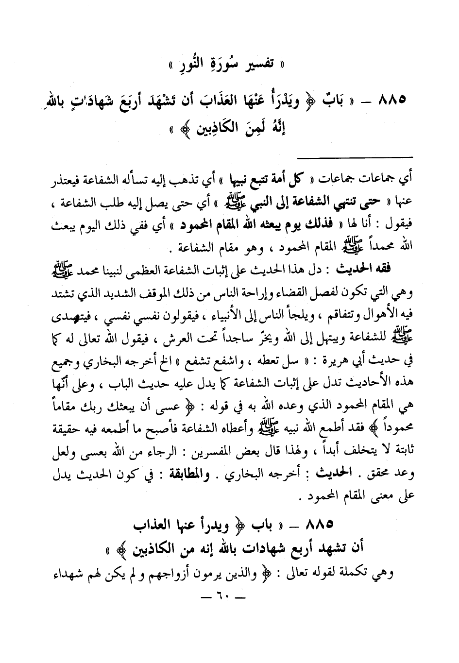 885 - " بَابٌ (وَيَدْرَأُ عَنْهَا الْعَذَابَ أَنْ تَشْهَدَ أَرْبَعَ شَهَادَاتٍ بِاللَّهِ إِنَّهُ لَمِنَ الْكَاذِبِينَ) "