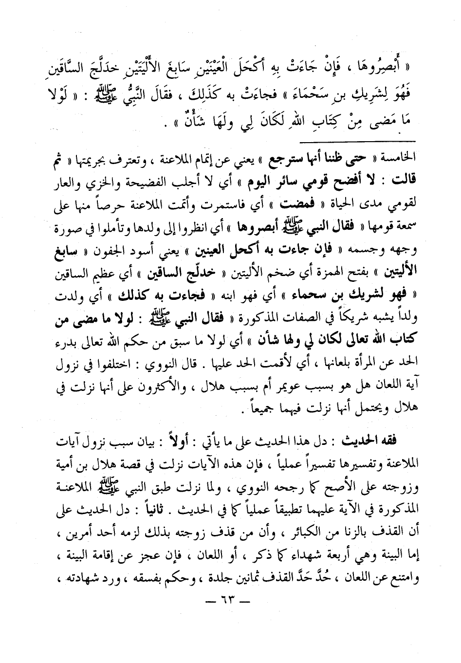 الخامسة " حتى ظننا أنها سترجع " يعني عن إتمام الملاعنة، وتعترف بجريمتها " ثم قالت: لا أفضح قومي سائر اليوم " أي لا أجلب الفضيحة والخزي والعار لقومي مدى الحياة " فمضت " أي فاستمرت وأتمت الملاعنة حرصاً منها على سمعة قومها " فقال النبي - صلى الله عليه وسلم - أبصروها " أي انظروا إلى ولدها وتأملوا في صورة وجهه وجسمه " فإن جاءت به أكحل العينين " يعني أسود الجفون " سابغ الأليتين " بفتح الهمزة أي ضخم الأليتين " خدلّج الساقين " أي عظيم الساقين " فهو لشريك بن سحماء " أي فهو ابنه " فجاءت به كذلك " أي ولدت ولداً يشبه شريكاً في الصفات المذكورة " فقال النبي - صلى الله عليه وسلم -: لولا ما مضى من كتاب الله تعالى لكان لي ولها شأن " أي لولا ما سبق من حكم الله تعالى بدرء الحد عن المرأة بلعانها، أي لأقمت الحد عليها. قال النووي: اختلفوا في نزول آية اللعان هل هو بسبب عويمر أم بسبب هلال، والأكثرون على أنها نزلت في هلال ويحتمل أنها نزلت فيهما جميعاً.