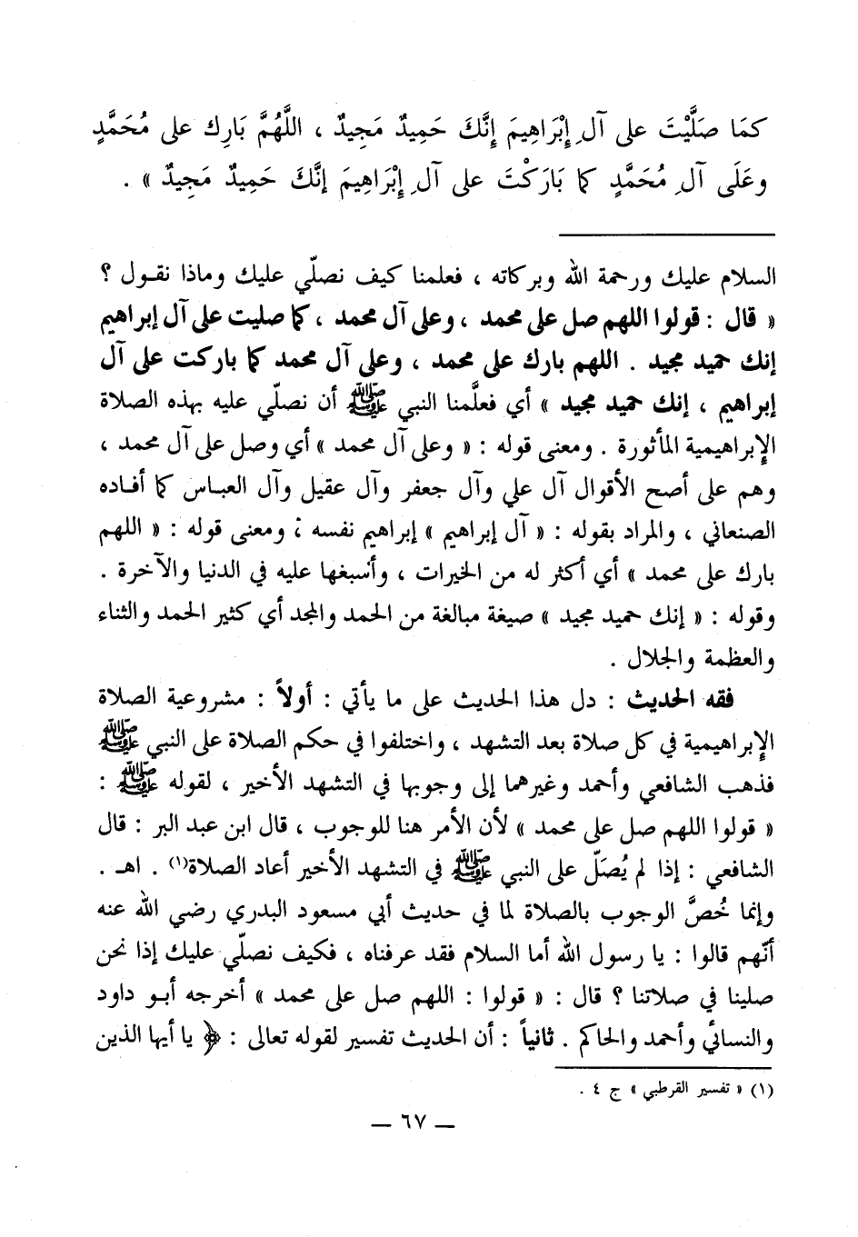 السلام عليك ورحمة الله وبركاته، فعلمنا كيف نصلّي عليك وماذا نقول؟ " قال: قولوا اللهم صل على محمد، وعلى آل محمد، كما صليت على آل إبراهيم إنك حميد مجيد. اللهم بارك على محمد، وعلى آل محمد كما باركت على آل إبراهيم، إنك حميد مجيد " أي فعلَّمنا النبي - صلى الله عليه وسلم - أن نصلّي عليه بهذه الصلاة الإبراهيمية المأثورة. ومعنى قوله: " وعلى آل محمد " أي وصل على آل محمد، وهم على أصح الأقوال آل علي وآل جعفر وآل عقيل وآل العباس كما أفاده الصنعاني، والمراد بقوله: " آل إبراهيم " إبراهيم نفسه، ومعنى قوله: " اللهم بارك على محمد " أي أكثر له من الخيرات، وأسبغها عليه في الدنيا والآخرة. وقوله: " إنك حميد مجيد " صيغة مبالغة من الحمد والمجد أي كثير الحمد والثناء والعظمة والجلال.