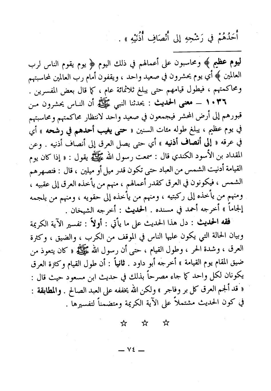 1036 - معنى الحديث: يحدثنا النبي - صلى الله عليه وسلم - أن الناس يحشرون من قبورهم إلى أرض المحشر فيجمعون في صعيد واحد لانتظار محاكمتهم ومحاسبتهم في يوم عظيم، يبلغ طوله مئات السنين " حتى يغيب أحدهم في رشحه " أي في عرقه " إلى أنصاف أذنيه " أي حتى يصل العرق إلى أنصاف أذنيه. وعن المقداد بن الأسود الكندي قال: سمعت رسول الله - صلى الله عليه وسلم - يقول: " إذا كان يوم القيامة أدنيت الشمس من العباد حتى تكون قدر ميل أو ميلين، قال: فتصهرهم الشمس، فيكونون في العرق كقدر أعمالهم، منهم من يأخذه العرق إلى عقبيه، ومنهم من يأخذه إلى ركبتيه، ومنهم من يأخذه إلى حقويه، ومنهم من يلجمه إلجاماً " أخرجه أحمد في مسنده. الحديث: أخرجه الشيخان.