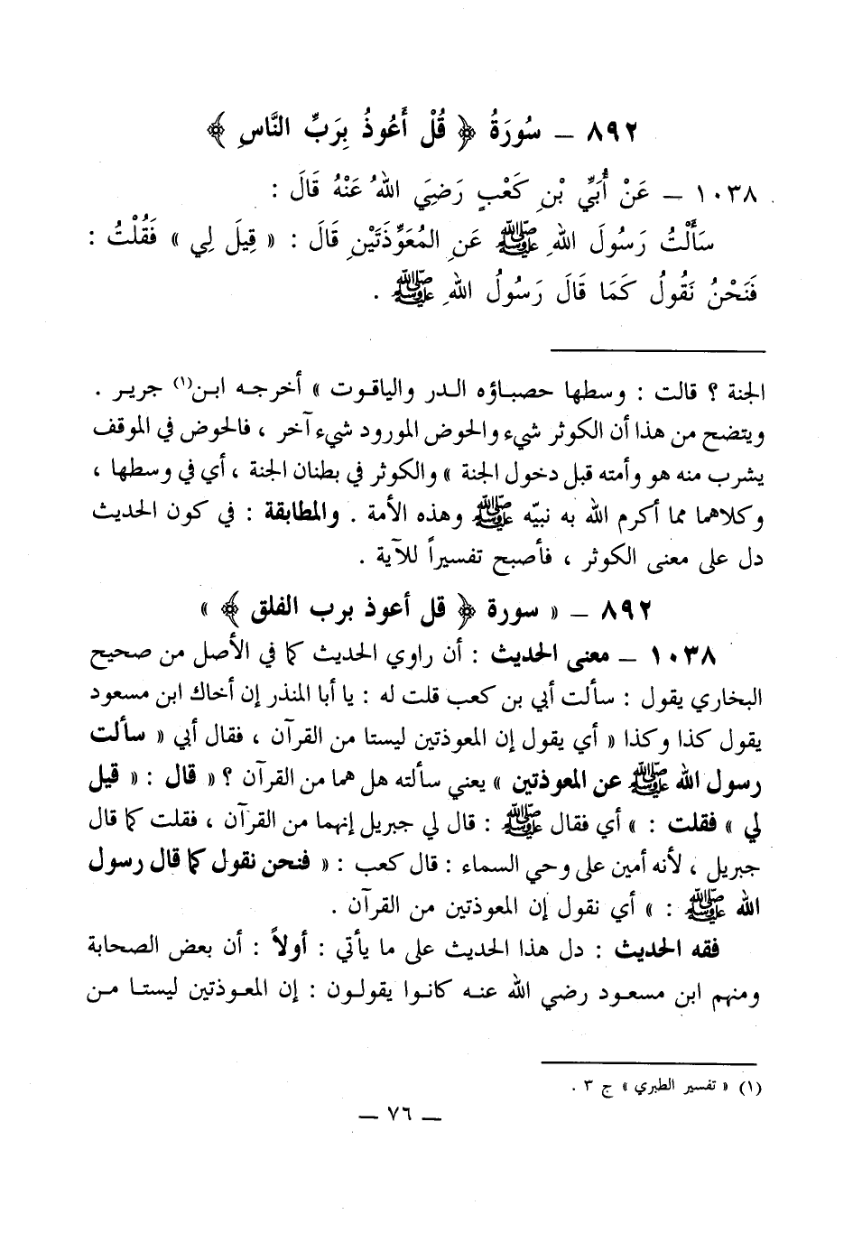 ْ1038 - معنى الحديث: أن راوي الحديث كما في الأصل من صحيح البخاري يقول: سألت أُبي بن كعب قلت له: يا أبا المنذر إن أخاك ابن مسعود يقول كذا وكذا " أي يقول إن المعوذتين ليستا من القرآن، فقال أبي " سألت رسول الله - صلى الله عليه وسلم - عن المعوذتين " يعني سألته هل هما من القرآن؟ " قال: " قيل لي " فقلت: " أي فقال - صلى الله عليه وسلم -: قال لي جبريل إنهما من القرآن، فقلت كما قال جبريل، لأنه أمين على وحي السماء: قال كعب: " فنحن نقول كما قال رسول الله - صلى الله عليه وسلم -: " أي نقول أن المعوذتين من القرآن.