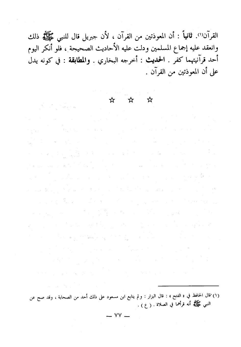(¬1) قال الحافظ في " الفتح ": قال البزار: ولم يتابع ابن مسعود على ذلك أحد من الصحابة، وقد صح عن النبي - صلى الله عليه وسلم - أنه قرأهما في الصلاة. (ع).