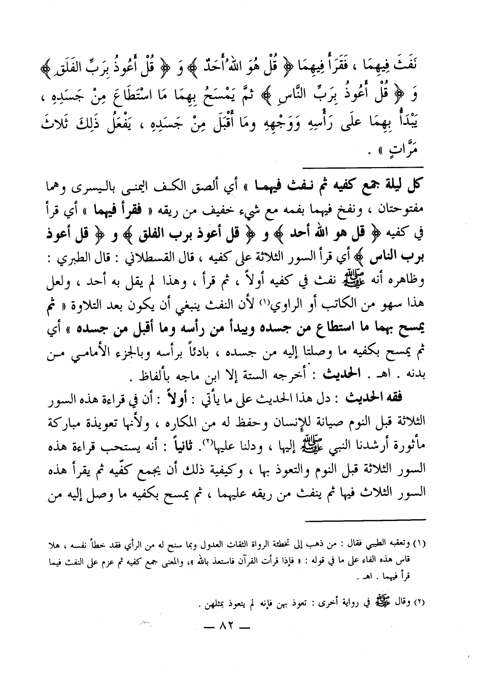 فقه الحديث: دل هذا الحديث على ما يأتي: أولاً: أن في قراءة هذه السور الثلاثة قبل النوم صيانة للإنسان وحفظ له من المكاره، ولأنها تعويذة مباركة مأثورة أرشدنا النبي - صلى الله عليه وسلم - إليها، ودلنا عليها (¬2). ثانياًً: أنه يستحب قراءة هذه السور الثلاثة قبل النوم والتعوذ بها، وكيفية ذلك أن يجمع كفّيه ثم يقرأ هذه السور الثلاث فيها ثم ينفث من ريقه عليهما، ثم يمسح بكفيه ما وصل إليه من