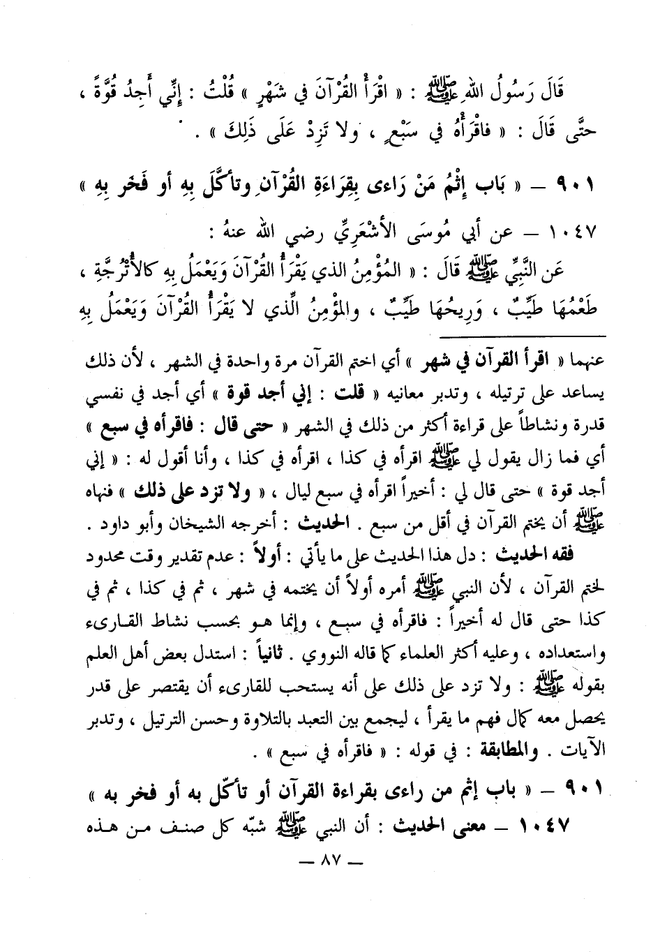 عنهما " اقرأ القرآن في شهر " أي اختم القرآن مرة واحدة في الشهر، لأن ذلك يساعد على ترتيله، وتدبر معانيه " قلت: إني أجد قوة " أي أجد في نفسي قدرة ونشاطاً على قراءة أكثر من ذلك في الشهر " حتى قال: فاقرأه في سبع " أي فما زال يقول في - صلى الله عليه وسلم - اقرأه في كذا، اقرأه في كذا، وأنا أقول له: " إني أجد قوة " حتى قال لي: أخيراً اقرأه في سبع ليال، " ولا تزد على ذلك " فنهاه - صلى الله عليه وسلم - أن يختم القرآن في أقل من سبع. الحديث: أخرجه الشيخان وأبو داود.