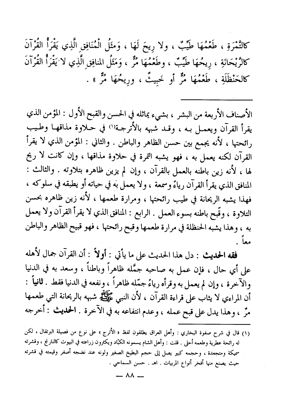 الأصناف الأربعة من البشر، بشيء يماثله في الحسن والقبح الأول: المؤمن الذي يقرأ القرآن ويعمل به، وقد شبهه بالأترجة (¬1) في حلاوة مذاقها وطيب رائحتها، لأنه يجمع بين حسن الظاهر والباطن. والثاني: المؤمن الذي لا يقرأ القرآن لكنه يعمل به، فهو يشبه التمرة في حلاوة مذاقها، وإن كانت لا ريح لها، لأنه زين باطنه بالعمل بالقرآن، وإن لم يزين ظاهره بتلاوته. والثالث: المنافق الذي يقرأ القرآن رياءً وسمعة، ولا يعمل به في حياته أو يطبقه في سلوكه، فهذا يشبه الريحانة في طيب رائحتها، ومرارة طعمها، لأنه زين ظاهره بحسن التلاوة، وقّبح باطنه بسوء العمل. الرابع: المنافق الذي لا يقرأ القرآن ولا يعمل به، وهذا يشبه الحنظلة في مرارة طعمها وقبح رائحتها، فهو قبيح الظاهر والباطن معاً.