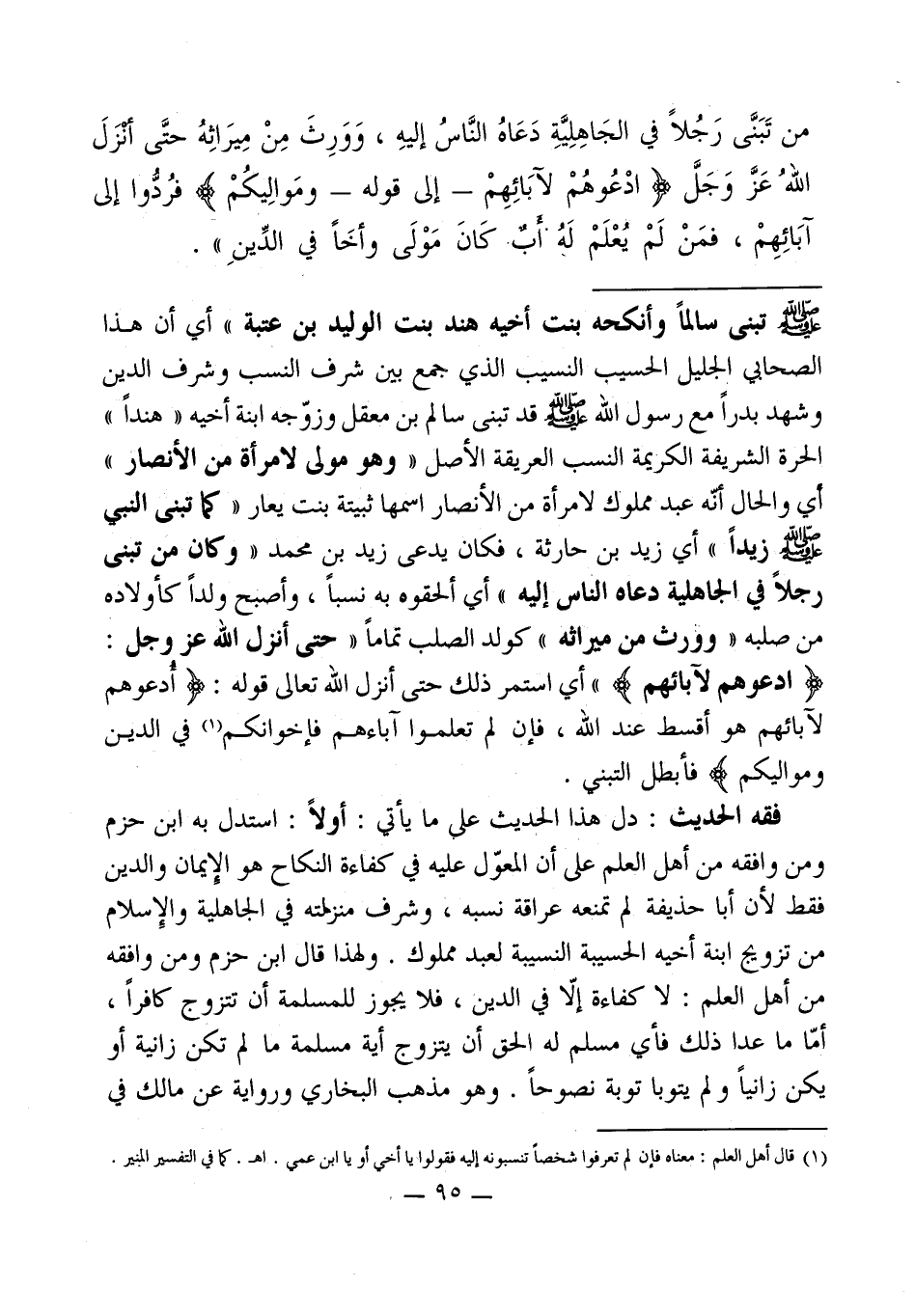 - صلى الله عليه وسلم - تبنى سالماً وأنكحه بنت أخيه هند بنت الوليد بن عتبة" أي أن هذا الصحابي الجليل الحسيب النسيب الذي جمع بين شرف النسب وشرف الدين وشهد بدراً مع رسول الله - صلى الله عليه وسلم - قد تبنى سالم بن معقل وزوّجه ابنة أخيه " هنداً " الحرة الشريفة الكريمة النسب العريقة الأصل " وهو مولى لامرأة من الأنصار " أي والحال أنّه عبد مملوك لامرأة من الأنصار اسمها ثبيتة بنت يعار " كما تبنى النبي - صلى الله عليه وسلم - زيداً " أي زيد بن حارثة، فكان يدعى زيد بن محمد " وكان من تبنى رجلاً في الجاهلية دعاه الناس إليه " أي ألحقوه به نسباً، وأصبح ولداً كأولاده من صلبه " وورث من ميراثه " كولد الصلب تماماً " حتى أنزل الله عز وجل: (ادْعُوهُمْ لِآبَائِهِمْ) " أي استمر ذلك حتى أنزل الله تعالى قوله: (ادْعُوهُمْ لِآبَائِهِمْ هُوَ أَقْسَطُ عِنْدَ اللَّهِ فَإِنْ لَمْ تَعْلَمُوا آبَاءَهُمْ فَإِخْوَانُكُمْ (¬1) فِي الدِّينِ وَمَوَالِيكُمْ) فأبطل التبني.