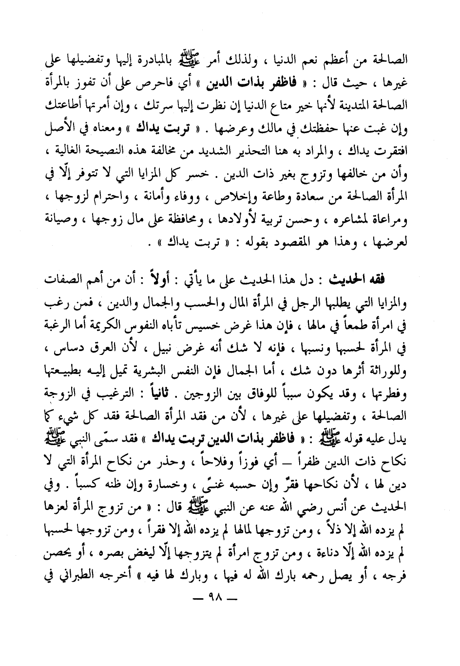 فقه الحديث: دل هذا الحديث على ما يأتي: أولاً: أن من أهم الصفات والمزايا التي يطلبها الرجل في المرأة المال والحسب والجمال والدين، فمن رغب في امرأة طمعاً في مالها، فإن هذا غرض خسيس تأباه النفوس الكريمة أما الرغبة في المرأة لحسبها ونسبها، فإنه لا شك أنه غرض نبيل، لأن العرق دساس، وللوراثة أثرها دون شك، أما الجمال فإن النفس البشرية تميل إليه بطبيعتها وفطرتها، وقد يكون سبباً للوفاق بين الزوجين. ثانياً: الترغيب في الزوجة الصالحة، وتفضيلها على غيرها، لأن من فقد المرأة الصالحة فقد كل شيء كما يدل عليه قوله - صلى الله عليه وسلم -: " فاظفر بذات الدين تربت يداك " فقد سمّى النبي - صلى الله عليه وسلم - نكاح ذات الدين ظفراً - أي فوزاً وفلاحاً، وحذر من نكاح المرأة التي لا دين لها، لأن نكاحها فقرٌ وإن حسبه غنى، وخسارة وإن ظنه كسباً. وفي الحديث عن أنس رضي الله عنه عن النبي - صلى الله عليه وسلم - قال: " من تزوج المرأة لعزها لم يزده الله إلا ذلاً، ومن تزوجها لمالها لم يزده الله إلا فقراً، ومن تزوجها لحسبها لم يزده الله إلاّ دناءة، ومن تزوج امرأة لم يتزوجها إلاّ ليغض بصره، أو يحصن فرجه، أو يصل رحمه بارك الله له فيها، وبارك لها فيه " أخرجه الطبراني في