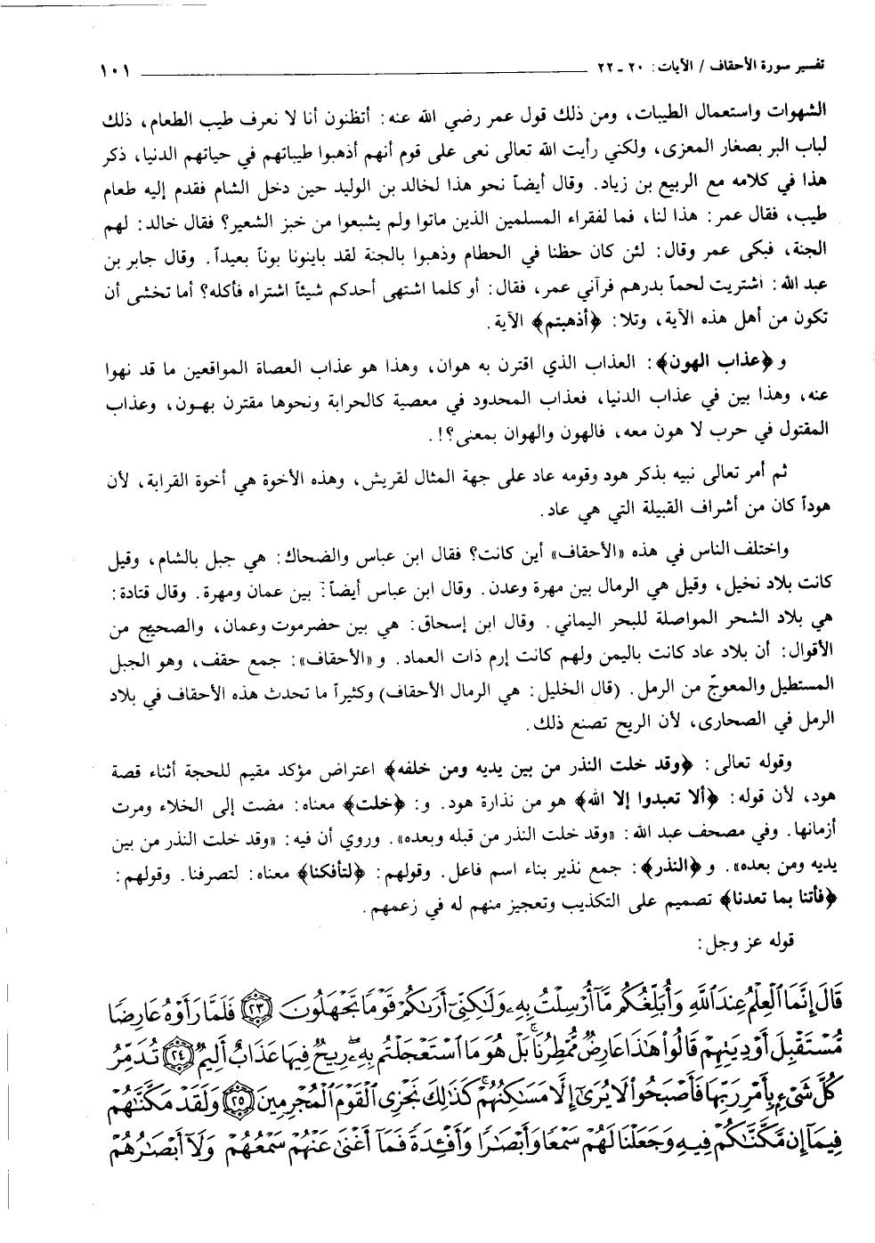 هي بلاد الشحر المواصلة للبحر اليماني. وقال ابن إسحاق: هي بين حضر موت وعمان، والصحيح من الأقوال: أن بلاد عاد كانت باليمن ولهم كانت إرم ذات العماد. و «الأحقاف» : جمع حقف، وهو الجبل المستطيل والمعوجّ من الرمل. (قال الخليل: هي الرمال الأحقاف) وكثيرا ما تحدث هذه الأحقاف في بلاد الرمل في الصحارى، لأن الريح تصنع ذلك.