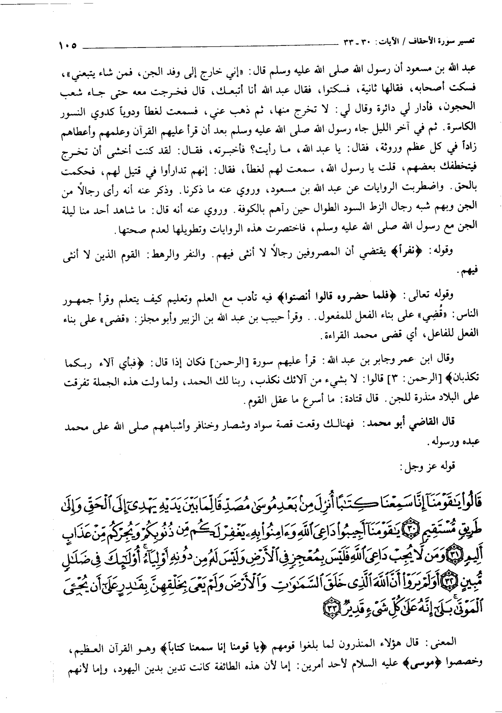 قالُوا يا قَوْمَنا إِنَّا سَمِعْنا كِتاباً أُنْزِلَ مِنْ بَعْدِ مُوسى مُصَدِّقاً لِما بَيْنَ يَدَيْهِ يَهْدِي إِلَى الْحَقِّ وَإِلى طَرِيقٍ مُسْتَقِيمٍ (٣٠) يا قَوْمَنا أَجِيبُوا داعِيَ اللَّهِ وَآمِنُوا بِهِ يَغْفِرْ لَكُمْ مِنْ ذُنُوبِكُمْ وَيُجِرْكُمْ مِنْ عَذابٍ أَلِيمٍ (٣١) وَمَنْ لا يُجِبْ داعِيَ اللَّهِ فَلَيْسَ بِمُعْجِزٍ فِي الْأَرْضِ وَلَيْسَ لَهُ مِنْ دُونِهِ أَوْلِياءُ أُولئِكَ فِي ضَلالٍ مُبِينٍ (٣٢) أَوَلَمْ يَرَوْا أَنَّ اللَّهَ الَّذِي خَلَقَ السَّماواتِ وَالْأَرْضَ وَلَمْ يَعْيَ بِخَلْقِهِنَّ بِقادِرٍ عَلى أَنْ يُحْيِيَ الْمَوْتى بَلى إِنَّهُ عَلى كُلِّ شَيْءٍ قَدِيرٌ (٣٣)