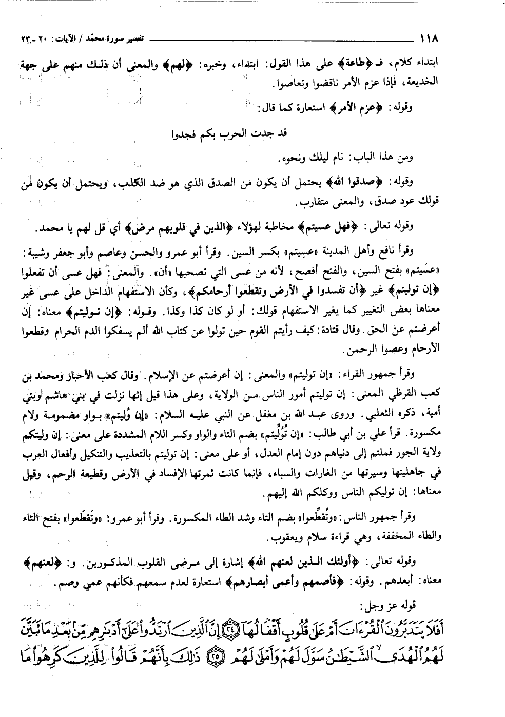 «عسيتم» بفتح السين، والفتح أفصح، لأنه من عسى التي تصحبها «أن» . والمعنى: فهل عسى أن تفعلوا إِنْ تَوَلَّيْتُمْ غير أَنْ تُفْسِدُوا فِي الْأَرْضِ وَتُقَطِّعُوا أَرْحامَكُمْ، وكأن الاستفهام الداخل على عسى غير معناها بعض التغيير كما يغير الاستفهام قولك: أو لو كان كذا وكذا. وقوله: إِنْ تَوَلَّيْتُمْ معناه: إن أعرضتم عن الحق. وقال قتادة: كيف رأيتم القوم حين تولوا عن كتاب الله ألم يسفكوا الدم الحرام وقطعوا الأرحام وعصوا الرحمن.