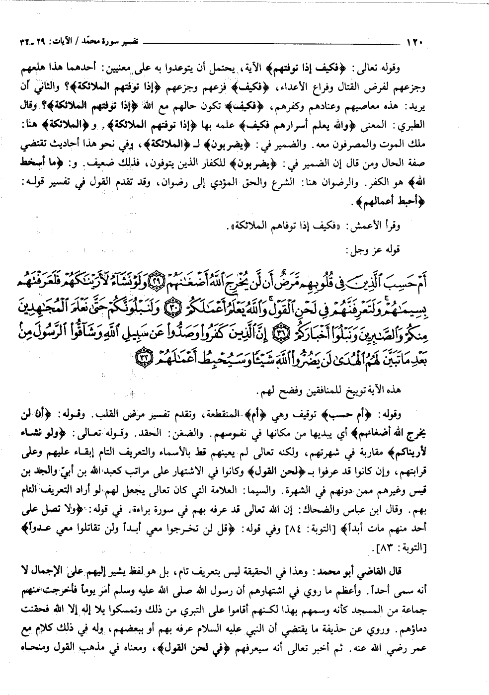 أَمْ حَسِبَ الَّذِينَ فِي قُلُوبِهِمْ مَرَضٌ أَنْ لَنْ يُخْرِجَ اللَّهُ أَضْغانَهُمْ (٢٩) وَلَوْ نَشاءُ لَأَرَيْناكَهُمْ فَلَعَرَفْتَهُمْ بِسِيماهُمْ وَلَتَعْرِفَنَّهُمْ فِي لَحْنِ الْقَوْلِ وَاللَّهُ يَعْلَمُ أَعْمالَكُمْ (٣٠) وَلَنَبْلُوَنَّكُمْ حَتَّى نَعْلَمَ الْمُجاهِدِينَ مِنْكُمْ وَالصَّابِرِينَ وَنَبْلُوَا أَخْبارَكُمْ (٣١) إِنَّ الَّذِينَ كَفَرُوا وَصَدُّوا عَنْ سَبِيلِ اللَّهِ وَشَاقُّوا الرَّسُولَ مِنْ بَعْدِ ما تَبَيَّنَ لَهُمُ الْهُدى لَنْ يَضُرُّوا اللَّهَ شَيْئاً وَسَيُحْبِطُ أَعْمالَهُمْ (٣٢)