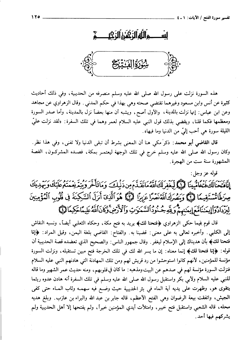إِنَّا فَتَحْنا لَكَ فَتْحاً مُبِيناً (١) لِيَغْفِرَ لَكَ اللَّهُ ما تَقَدَّمَ مِنْ ذَنْبِكَ وَما تَأَخَّرَ وَيُتِمَّ نِعْمَتَهُ عَلَيْكَ وَيَهْدِيَكَ صِراطاً مُسْتَقِيماً (٢) وَيَنْصُرَكَ اللَّهُ نَصْراً عَزِيزاً (٣) هُوَ الَّذِي أَنْزَلَ السَّكِينَةَ فِي قُلُوبِ الْمُؤْمِنِينَ لِيَزْدادُوا إِيماناً مَعَ إِيمانِهِمْ وَلِلَّهِ جُنُودُ السَّماواتِ وَالْأَرْضِ وَكانَ اللَّهُ عَلِيماً حَكِيماً (٤)