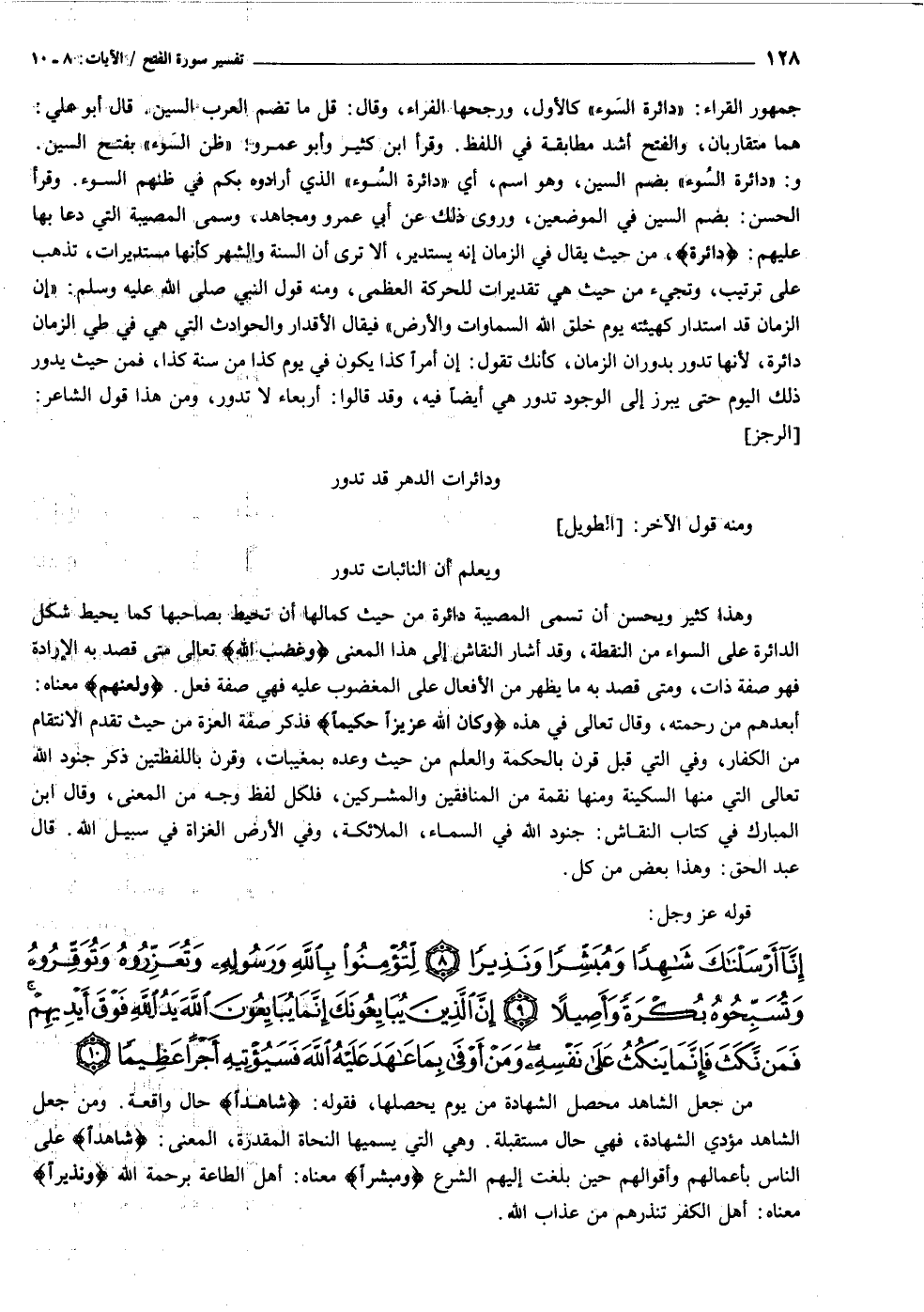 إِنَّا أَرْسَلْناكَ شاهِداً وَمُبَشِّراً وَنَذِيراً (٨) لِتُؤْمِنُوا بِاللَّهِ وَرَسُولِهِ وَتُعَزِّرُوهُ وَتُوَقِّرُوهُ وَتُسَبِّحُوهُ بُكْرَةً وَأَصِيلاً (٩) إِنَّ الَّذِينَ يُبايِعُونَكَ إِنَّما يُبايِعُونَ اللَّهَ يَدُ اللَّهِ فَوْقَ أَيْدِيهِمْ فَمَنْ نَكَثَ فَإِنَّما يَنْكُثُ عَلى نَفْسِهِ وَمَنْ أَوْفى بِما عاهَدَ عَلَيْهُ اللَّهَ فَسَيُؤْتِيهِ أَجْراً عَظِيماً (١٠)