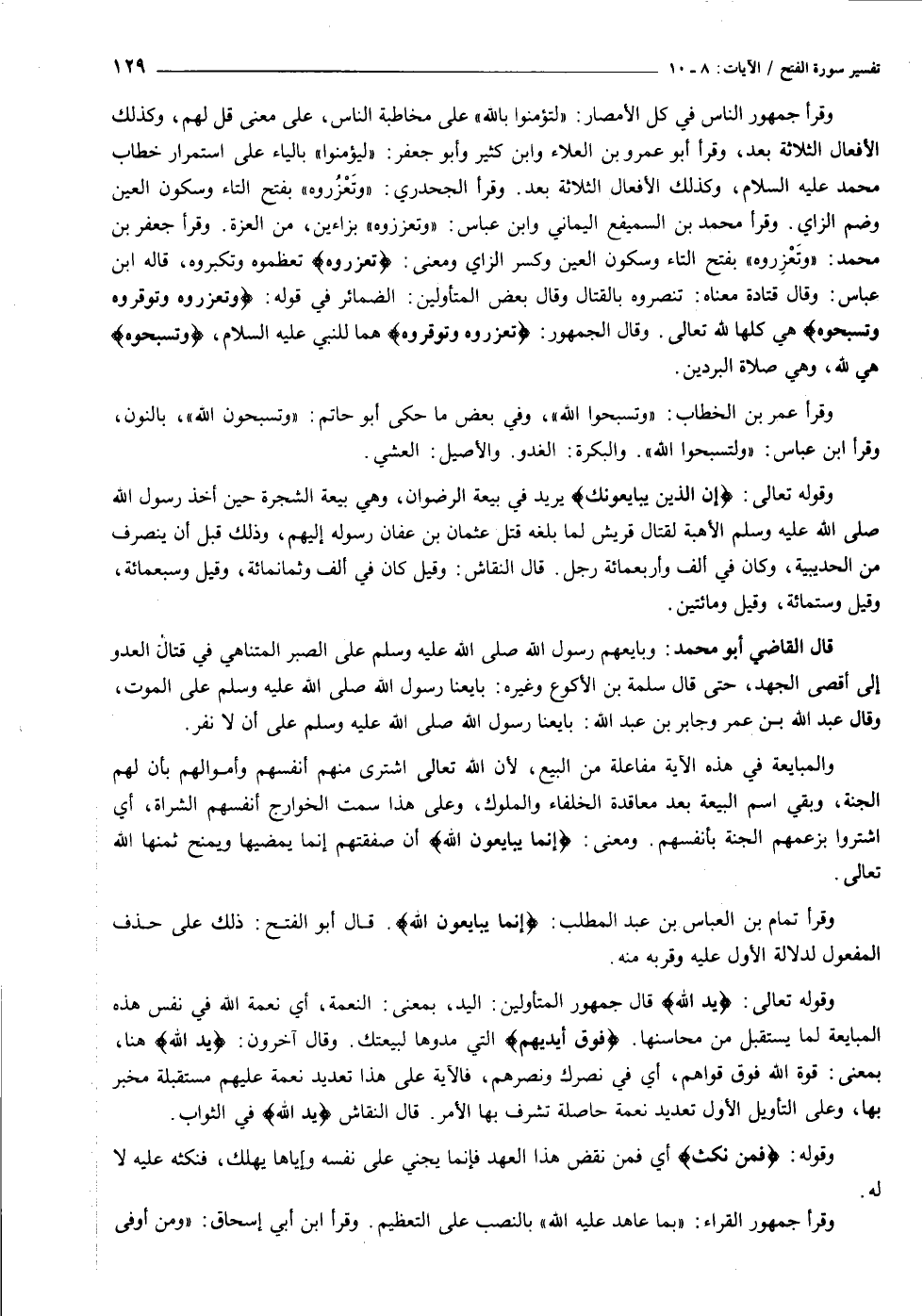 وقوله تعالى: يَدُ اللَّهِ قال جمهور المتأولين: اليد، بمعنى: النعمة، أي نعمة الله في نفس هذه المبايعة لما يستقبل من محاسنها. فَوْقَ أَيْدِيهِمْ التي مدوها لبيعتك. وقال آخرون: يَدُ اللَّهِ هنا، بمعنى: قوة الله فوق قواهم، أي في نصرك ونصرهم، فالآية على هذا تعديد نعمة عليهم مستقبلة مخبر بها، وعلى التأويل الأول تعديد نعمة حاصلة تشرف بها الأمر. قال النقاش يَدُ اللَّهِ في الثواب.