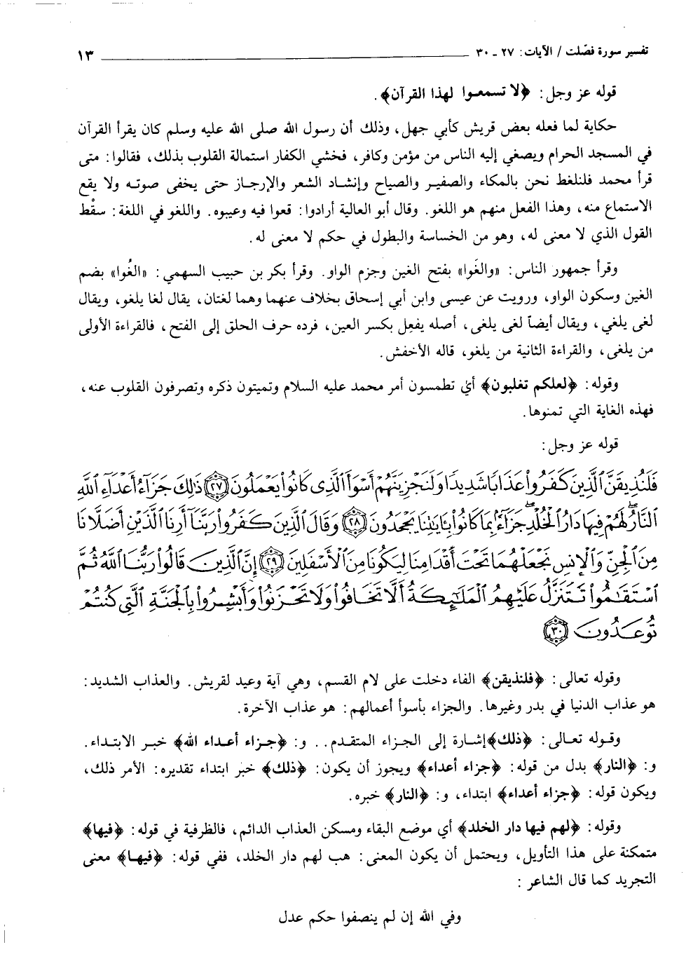فَلَنُذِيقَنَّ الَّذِينَ كَفَرُوا عَذاباً شَدِيداً وَلَنَجْزِيَنَّهُمْ أَسْوَأَ الَّذِي كانُوا يَعْمَلُونَ (٢٧) ذلِكَ جَزاءُ أَعْداءِ اللَّهِ النَّارُ لَهُمْ فِيها دارُ الْخُلْدِ جَزاءً بِما كانُوا بِآياتِنا يَجْحَدُونَ (٢٨) وَقالَ الَّذِينَ كَفَرُوا رَبَّنا أَرِنَا الَّذَيْنِ أَضَلاَّنا مِنَ الْجِنِّ وَالْإِنْسِ نَجْعَلْهُما تَحْتَ أَقْدامِنا لِيَكُونا مِنَ الْأَسْفَلِينَ (٢٩) إِنَّ الَّذِينَ قالُوا رَبُّنَا اللَّهُ ثُمَّ اسْتَقامُوا تَتَنَزَّلُ عَلَيْهِمُ الْمَلائِكَةُ أَلاَّ تَخافُوا وَلا تَحْزَنُوا وَأَبْشِرُوا بِالْجَنَّةِ الَّتِي كُنْتُمْ تُوعَدُونَ (٣٠)