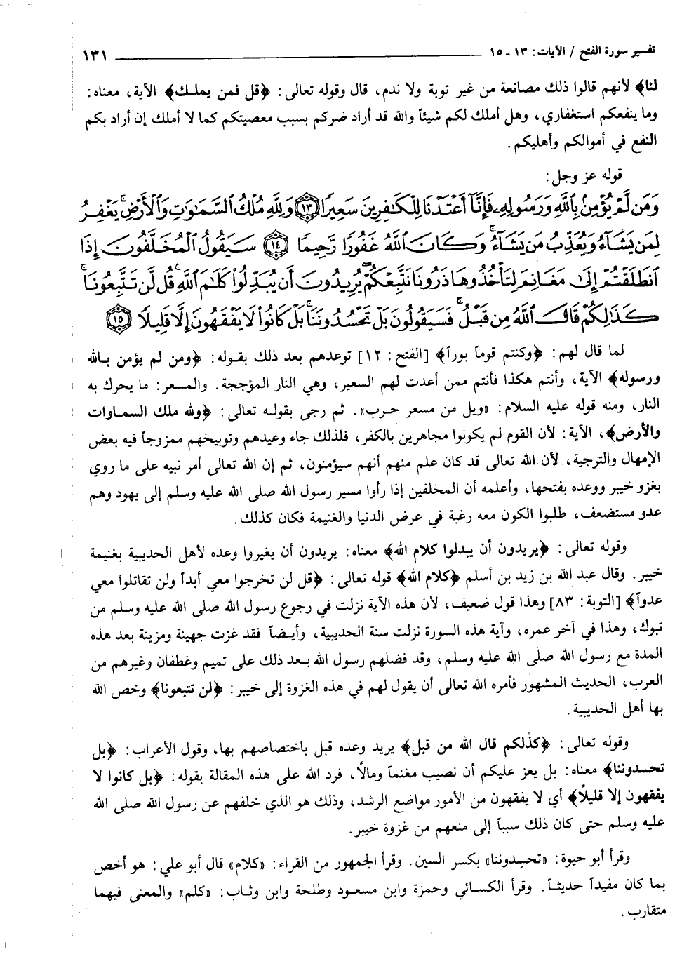 وَمَنْ لَمْ يُؤْمِنْ بِاللَّهِ وَرَسُولِهِ فَإِنَّا أَعْتَدْنا لِلْكافِرِينَ سَعِيراً (١٣) وَلِلَّهِ مُلْكُ السَّماواتِ وَالْأَرْضِ يَغْفِرُ لِمَنْ يَشاءُ وَيُعَذِّبُ مَنْ يَشاءُ وَكانَ اللَّهُ غَفُوراً رَحِيماً (١٤) سَيَقُولُ الْمُخَلَّفُونَ إِذَا انْطَلَقْتُمْ إِلى مَغانِمَ لِتَأْخُذُوها ذَرُونا نَتَّبِعْكُمْ يُرِيدُونَ أَنْ يُبَدِّلُوا كَلامَ اللَّهِ قُلْ لَنْ تَتَّبِعُونا كَذلِكُمْ قالَ اللَّهُ مِنْ قَبْلُ فَسَيَقُولُونَ بَلْ تَحْسُدُونَنا بَلْ كانُوا لا يَفْقَهُونَ إِلاَّ قَلِيلاً (١٥)