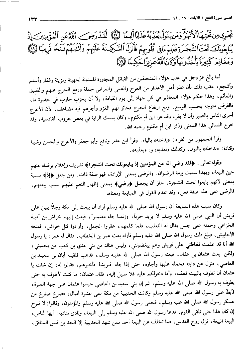 لَيْسَ عَلَى الْأَعْمى حَرَجٌ وَلا عَلَى الْأَعْرَجِ حَرَجٌ وَلا عَلَى الْمَرِيضِ حَرَجٌ وَمَنْ يُطِعِ اللَّهَ وَرَسُولَهُ يُدْخِلْهُ جَنَّاتٍ تَجْرِي مِنْ تَحْتِهَا الْأَنْهارُ وَمَنْ يَتَوَلَّ يُعَذِّبْهُ عَذاباً أَلِيماً (١٧) لَقَدْ رَضِيَ اللَّهُ عَنِ الْمُؤْمِنِينَ إِذْ يُبايِعُونَكَ تَحْتَ الشَّجَرَةِ فَعَلِمَ ما فِي قُلُوبِهِمْ فَأَنْزَلَ السَّكِينَةَ عَلَيْهِمْ وَأَثابَهُمْ فَتْحاً قَرِيباً (١٨) وَمَغانِمَ كَثِيرَةً يَأْخُذُونَها وَكانَ اللَّهُ عَزِيزاً حَكِيماً (١٩)