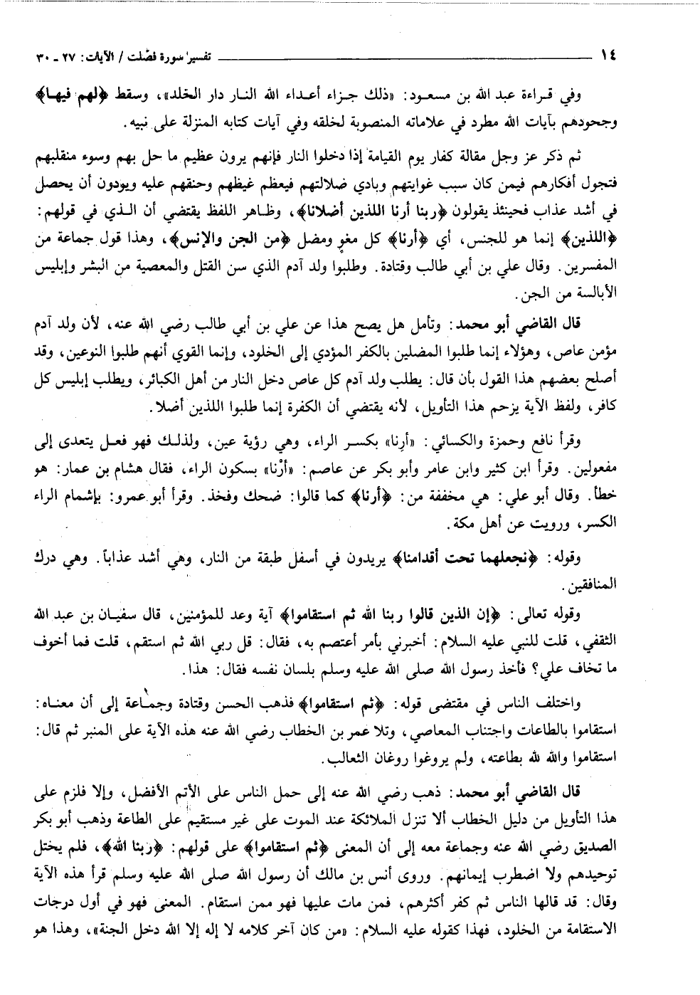 وقوله تعالى: إِنَّ الَّذِينَ قالُوا رَبُّنَا اللَّهُ ثُمَّ اسْتَقامُوا آية وعد للمؤمنين، قال سفيان بن عبد الله الثقفي، قلت للنبي عليه السلام: أخبرني بأمر أعتصم به، فقال: قل ربي الله ثم استقم، قلت فما أخوف ما تخاف علي؟ فأخذ رسول الله صلى الله عليه وسلم بلسان نفسه فقال: هذا.
