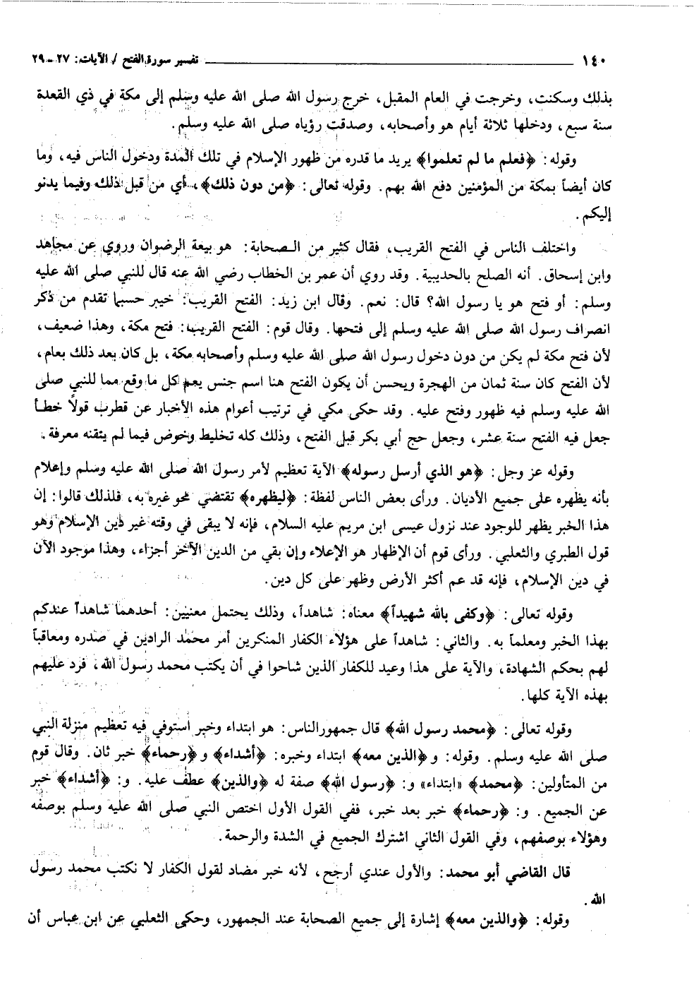 واختلف الناس في الفتح القريب، فقال كثير من الصحابة: هو بيعة الرضوان وروي عن مجاهد وابن إسحاق. أنه الصلح بالحديبية. وقد روي أن عمر بن الخطاب رضي الله عنه قال للنبي صلى الله عليه وسلم: أو فتح هو يا رسول الله؟ قال: نعم. وقال ابن زيد: الفتح القريب: خيبر حسبما تقدم من ذكر انصراف رسول الله صلى الله عليه وسلم إلى فتحها. وقال قوم: الفتح القريب: فتح مكة، وهذا ضعيف، لأن فتح مكة لم يكن من دون دخول رسول الله صلى الله عليه وسلم وأصحابه مكة، بل كان بعد ذلك بعام، لأن الفتح كان سنة ثمان من الهجرة ويحسن أن يكون الفتح هنا اسم جنس يعم كل ما وقع مما للنبي صلى الله عليه وسلم فيه ظهور وفتح عليه. وقد حكى مكي في ترتيب أعوام هذه الأخبار عن قطرب قولا خطأ جعل فيه الفتح سنة عشر، وجعل حج أبي بكر قبل الفتح، وذلك كله تخليط وخوض فيما لم يتقنه معرفة.