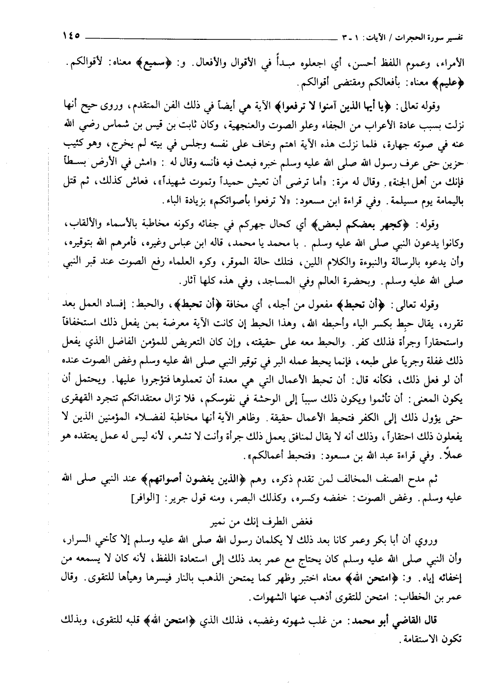 ثم مدح الصنف المخالف لمن تقدم ذكره، وهم الَّذِينَ يَغُضُّونَ أَصْواتَهُمْ عند النبي صلى الله عليه وسلم. وغض الصوت: خفضه وكسره، وكذلك البصر، ومنه قول جرير: [الوافر] فغض الطرف إنك من نمير وروي أن أبا بكر وعمر كانا بعد ذلك لا يكلمان رسول الله صلى الله عليه وسلم إلا كأخي السرار، وأن النبي صلى الله عليه وسلم كان يحتاج مع عمر بعد ذلك إلى استعادة اللفظ، لأنه كان لا يسمعه من إخفائه إياه. و: امْتَحَنَ اللَّهُ معناه اختبر وظهر كما يمتحن الذهب بالنار فيسرها وهيأها للتقوى. وقال عمر بن الخطاب: امتحن للتقوى أذهب عنها الشهوات.