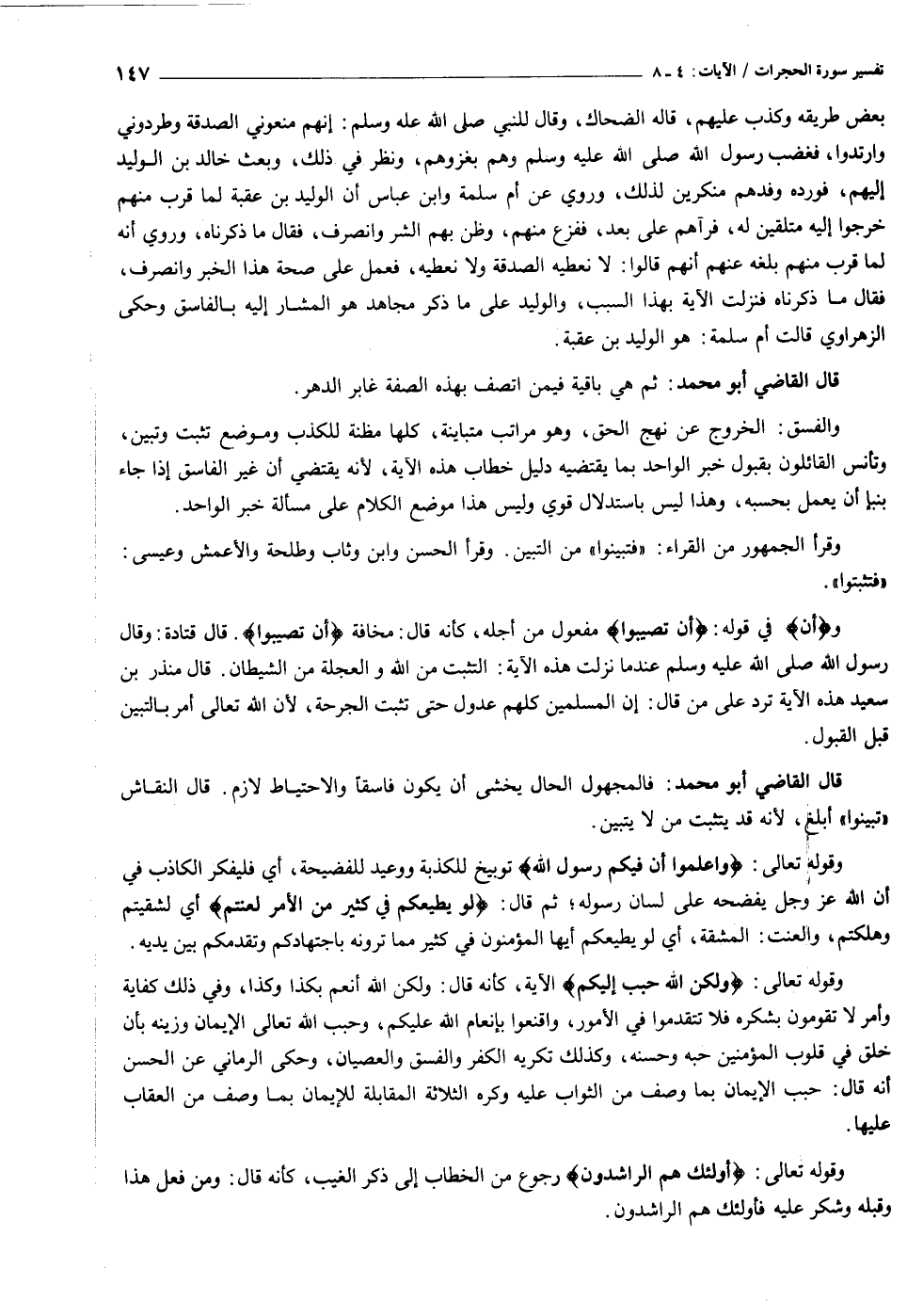 وإِنْ في قوله: أَنْ تُصِيبُوا مفعول من أجله، كأنه قال: مخافة أَنْ تُصِيبُوا. قال قتادة: وقال رسول الله صلى الله عليه وسلم عند ما نزلت هذه الآية: التثبت من الله والعجلة من الشيطان. قال منذر بن سعيد هذه الآية ترد على من قال: إن المسلمين كلهم عدول حتى تثبت الجرحة، لأن الله تعالى أمر بالتبين قبل القبول.