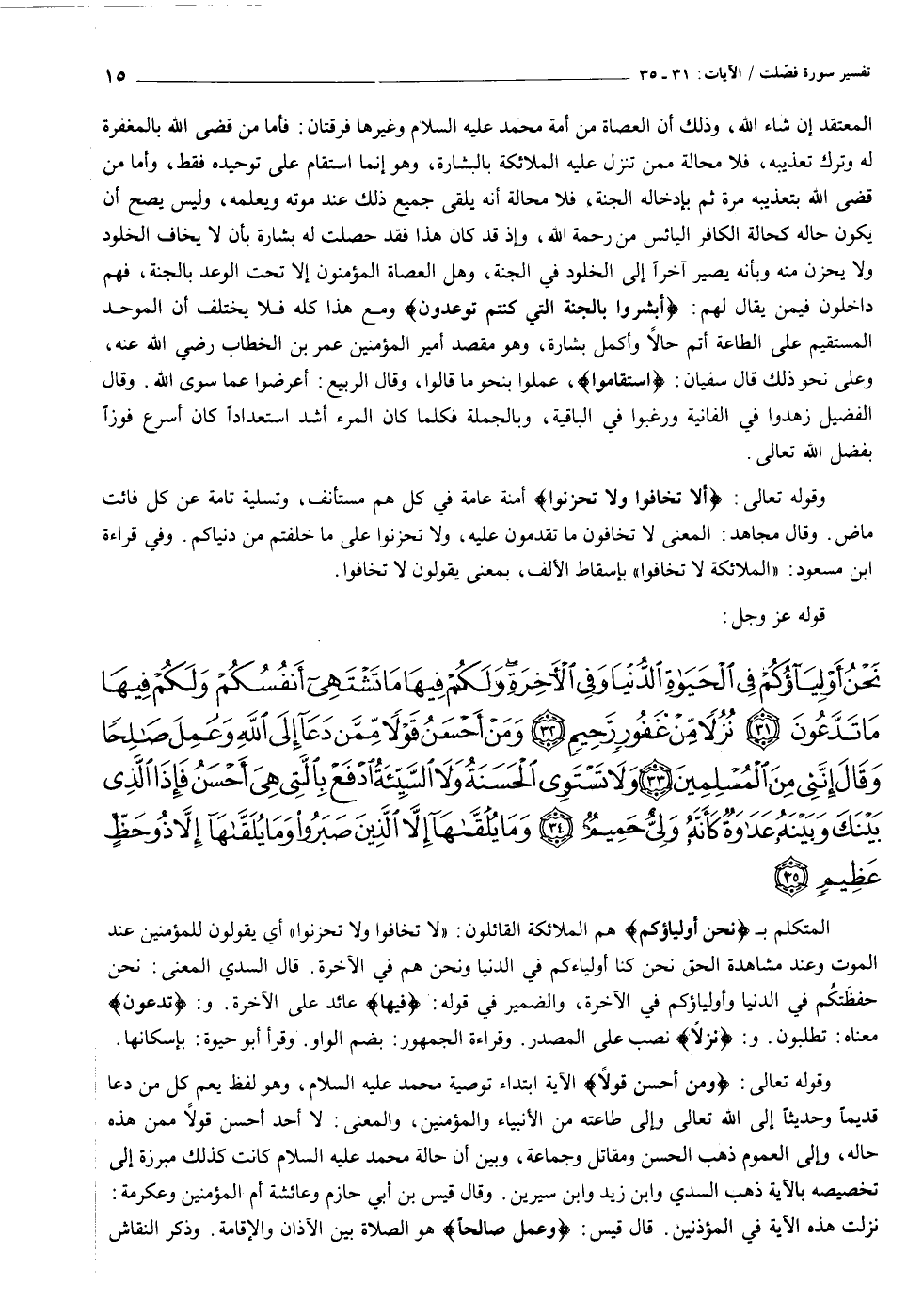 نَحْنُ أَوْلِياؤُكُمْ فِي الْحَياةِ الدُّنْيا وَفِي الْآخِرَةِ وَلَكُمْ فِيها ما تَشْتَهِي أَنْفُسُكُمْ وَلَكُمْ فِيها ما تَدَّعُونَ (٣١) نُزُلاً مِنْ غَفُورٍ رَحِيمٍ (٣٢) وَمَنْ أَحْسَنُ قَوْلاً مِمَّنْ دَعا إِلَى اللَّهِ وَعَمِلَ صالِحاً وَقالَ إِنَّنِي مِنَ الْمُسْلِمِينَ (٣٣) وَلا تَسْتَوِي الْحَسَنَةُ وَلا السَّيِّئَةُ ادْفَعْ بِالَّتِي هِيَ أَحْسَنُ فَإِذَا الَّذِي بَيْنَكَ وَبَيْنَهُ عَداوَةٌ كَأَنَّهُ وَلِيٌّ حَمِيمٌ (٣٤) وَما يُلَقَّاها إِلاَّ الَّذِينَ صَبَرُوا وَما يُلَقَّاها إِلاَّ ذُو حَظٍّ عَظِيمٍ (٣٥)