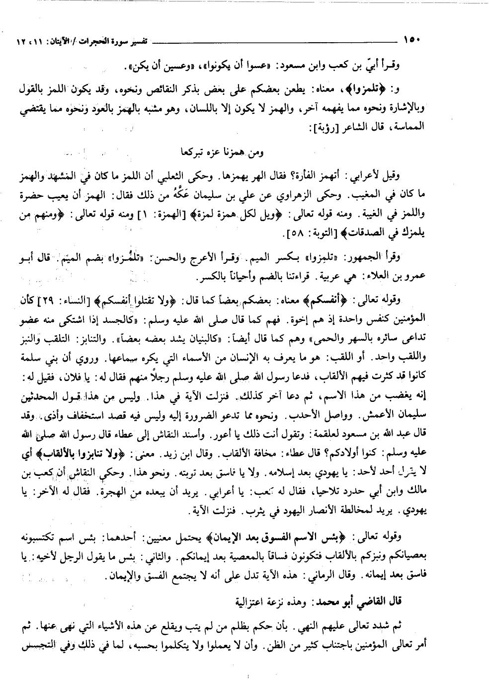 وقوله تعالى: أَنْفُسَكُمْ معناه: بعضكم بعضا كما قال: وَلا تَقْتُلُوا أَنْفُسَكُمْ [النساء: ٢٩] كأن المؤمنين كنفس واحدة إذ هم إخوة. فهم كما قال صلى الله عليه وسلم: «كالجسد إذا اشتكى منه عضو تداعى سائره بالسهر والحمى» وهم كما قال أيضا: «كالبنيان يشد بعضه بعضا» . والتنابز: التلقب والنبز واللقب واحد. أو اللقب: هو ما يعرف به الإنسان من الأسماء التي يكره سماعها. وروي أن بني سلمة كانوا قد كثرت فيهم الألقاب، فدعا رسول الله صلى الله عليه وسلم رجلا منهم فقال له: يا فلان، فقيل له: