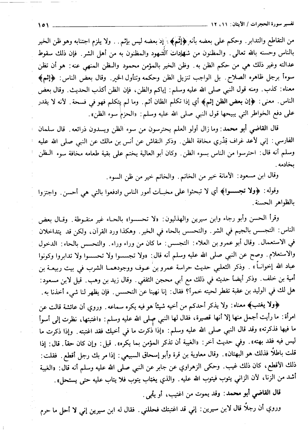 من التقاطع والتدابر. وحكم على بعضه بأنه إِثْمٌ: إذ بعضه ليس بإثم.. ولا يلزم اجتنابه وهو ظن الخير بالناس وحسنه بالله تعالى. والمظنون من شهادات الشهود والمظنون به من أهل الشر. فإن ذلك سقوط عدالته وغير ذلك هي من حكم الظن به. وظن الخير بالمؤمن محمود والظن المنهي عنه: هو أن تظن سوءا برجل ظاهره الصلاح. بل الواجب تنزيل الظن وحكمه وتتأول الخير. وقال بعض الناس: إِثْمٌ معناه: كذب. ومنه قول النبي صلى الله عليه وسلم: إياكم والظن، فإن الظن أكذب الحديث. وقال بعض الناس. معنى: إِنَّ بَعْضَ الظَّنِّ إِثْمٌ أي إذا تكلم الظان أثم. وما لم يتكلم فهو في فسحة. لأنه لا يقدر على دفع الخواطر التي يبيحها قول النبي صلى الله عليه وسلم: «الحزم سوء الظن» .