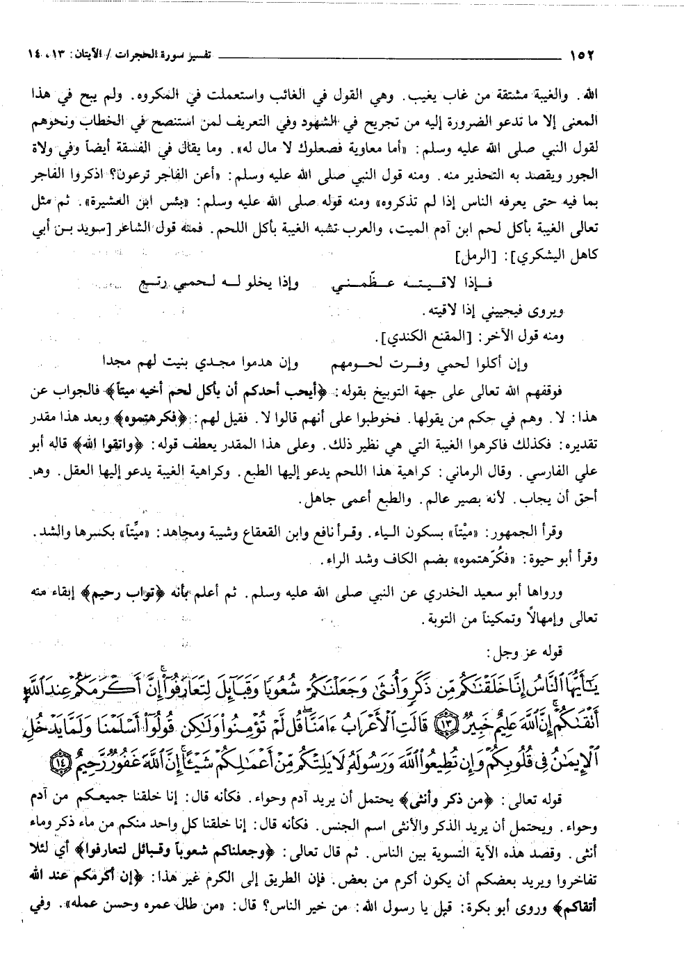 يا أَيُّهَا النَّاسُ إِنَّا خَلَقْناكُمْ مِنْ ذَكَرٍ وَأُنْثى وَجَعَلْناكُمْ شُعُوباً وَقَبائِلَ لِتَعارَفُوا إِنَّ أَكْرَمَكُمْ عِنْدَ اللَّهِ أَتْقاكُمْ إِنَّ اللَّهَ عَلِيمٌ خَبِيرٌ (١٣) قالَتِ الْأَعْرابُ آمَنَّا قُلْ لَمْ تُؤْمِنُوا وَلكِنْ قُولُوا أَسْلَمْنا وَلَمَّا يَدْخُلِ الْإِيمانُ فِي قُلُوبِكُمْ وَإِنْ تُطِيعُوا اللَّهَ وَرَسُولَهُ لا يَلِتْكُمْ مِنْ أَعْمالِكُمْ شَيْئاً إِنَّ اللَّهَ غَفُورٌ رَحِيمٌ (١٤)