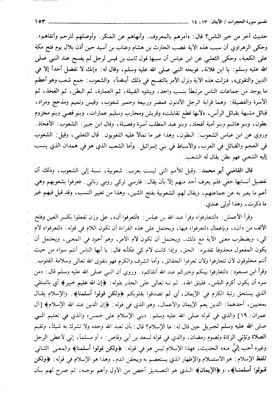 وحكى الزهراوي أن سبب هذه الآية غضب الحارث بن هشام وعتاب بن أسيد حين أذن بلال يوم فتح مكة على الكعبة، وحكى الثعلبي عن ابن عباس أن سببها قول ثابت بن قيس لرجل لم يفسح عند النبي صلى الله عليه وسلم: يا ابن فلانة، فوبخه النبي صلى الله عليه وسلم، وقال له: «إنك لا تفضل أحدا إلا في الدين والتقوى» ، فنزلت هذه الآية ونزل الأمر بالتفسح في ذلك أيضا، والشعوب: جمع شعب وهو أعظم ما يوجد من جماعات الناس مرتبطا بنسب واحد، ويتلوه القبيلة، ثم العمارة، ثم البطن، ثم الفخذ، ثم الأسرة والفصيلة: وهما قرابة الرجل الأدنون فمضر وربيعة وحمير شعوب، وقيس وتميم ومذحج ومراد، قبائل مشبهة بقبائل الرأس، «لأنها قطع تقابلت» وقريش ومحارب وسليم عمارات، وبنو قصي وبنو مخزوم بطون، وبنو هاشم وبنو أمية أفخاذ، وبنو عبد المطلب أسرة وفصيلة، وقال ابن جبير: الشعوب: الأفخاذ.
