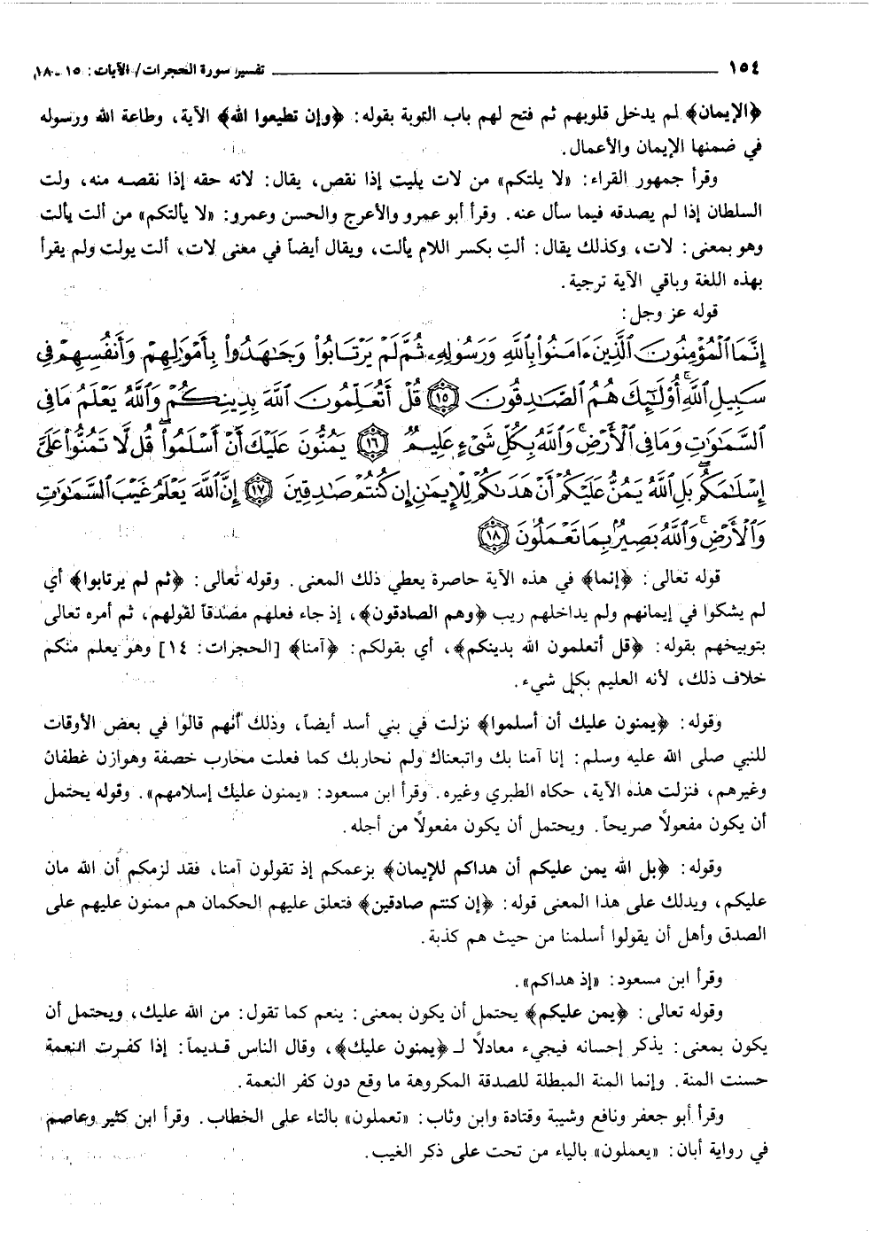 إِنَّمَا الْمُؤْمِنُونَ الَّذِينَ آمَنُوا بِاللَّهِ وَرَسُولِهِ ثُمَّ لَمْ يَرْتابُوا وَجاهَدُوا بِأَمْوالِهِمْ وَأَنْفُسِهِمْ فِي سَبِيلِ اللَّهِ أُولئِكَ هُمُ الصَّادِقُونَ (١٥) قُلْ أَتُعَلِّمُونَ اللَّهَ بِدِينِكُمْ وَاللَّهُ يَعْلَمُ ما فِي السَّماواتِ وَما فِي الْأَرْضِ وَاللَّهُ بِكُلِّ شَيْءٍ عَلِيمٌ (١٦) يَمُنُّونَ عَلَيْكَ أَنْ أَسْلَمُوا قُلْ لا تَمُنُّوا عَلَيَّ إِسْلامَكُمْ بَلِ اللَّهُ يَمُنُّ عَلَيْكُمْ أَنْ هَداكُمْ لِلْإِيمانِ إِنْ كُنْتُمْ صادِقِينَ (١٧) إِنَّ اللَّهَ يَعْلَمُ غَيْبَ السَّماواتِ وَالْأَرْضِ وَاللَّهُ بَصِيرٌ بِما تَعْمَلُونَ (١٨)
