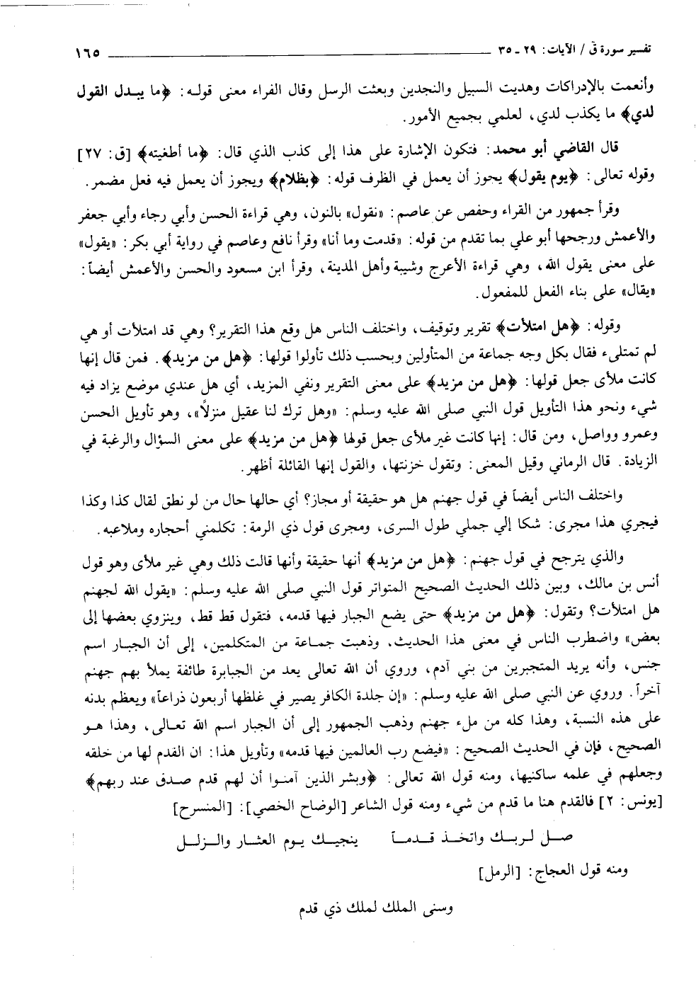 والذي يترجح في قول جهنم: هَلْ مِنْ مَزِيدٍ أنها حقيقة وأنها قالت ذلك وهي غير ملأى وهو قول أنس بن مالك، وبين ذلك الحديث الصحيح المتواتر قول النبي صلى الله عليه وسلم: «يقول الله لجهنم هل امتلأت؟ وتقول: هَلْ مِنْ مَزِيدٍ حتى يضع الجبار فيها قدمه، فتقول قط قط، وينزوي بعضها إلى بعض» واضطرب الناس في معنى هذا الحديث، وذهبت جماعة من المتكلمين، إلى أن الجبار اسم جنس، وأنه يريد المتجبرين من بني آدم، وروي أن الله تعالى يعد من الجبابرة طائفة يملأ بهم جهنم آخرا. وروي عن النبي صلى الله عليه وسلم: «إن جلدة الكافر يصير في غلظها أربعون ذراعا» ويعظم بدنه على هذه النسبة، وهذا كله من ملء جهنم وذهب الجمهور إلى أن الجبار اسم الله تعالى، وهذا هو الصحيح، فإن في الحديث الصحيح: «فيضع رب العالمين فيها قدمه» وتأويل هذا: ان القدم لها من خلقه وجعلهم في علمه ساكنيها، ومنه قول الله تعالى: وَبَشِّرِ الَّذِينَ آمَنُوا أَنَّ لَهُمْ قَدَمَ صِدْقٍ عِنْدَ رَبِّهِمْ [يونس: ٢] فالقدم هنا ما قدم من شيء ومنه قول الشاعر [الوضاح الخصي] : [المنسرح]