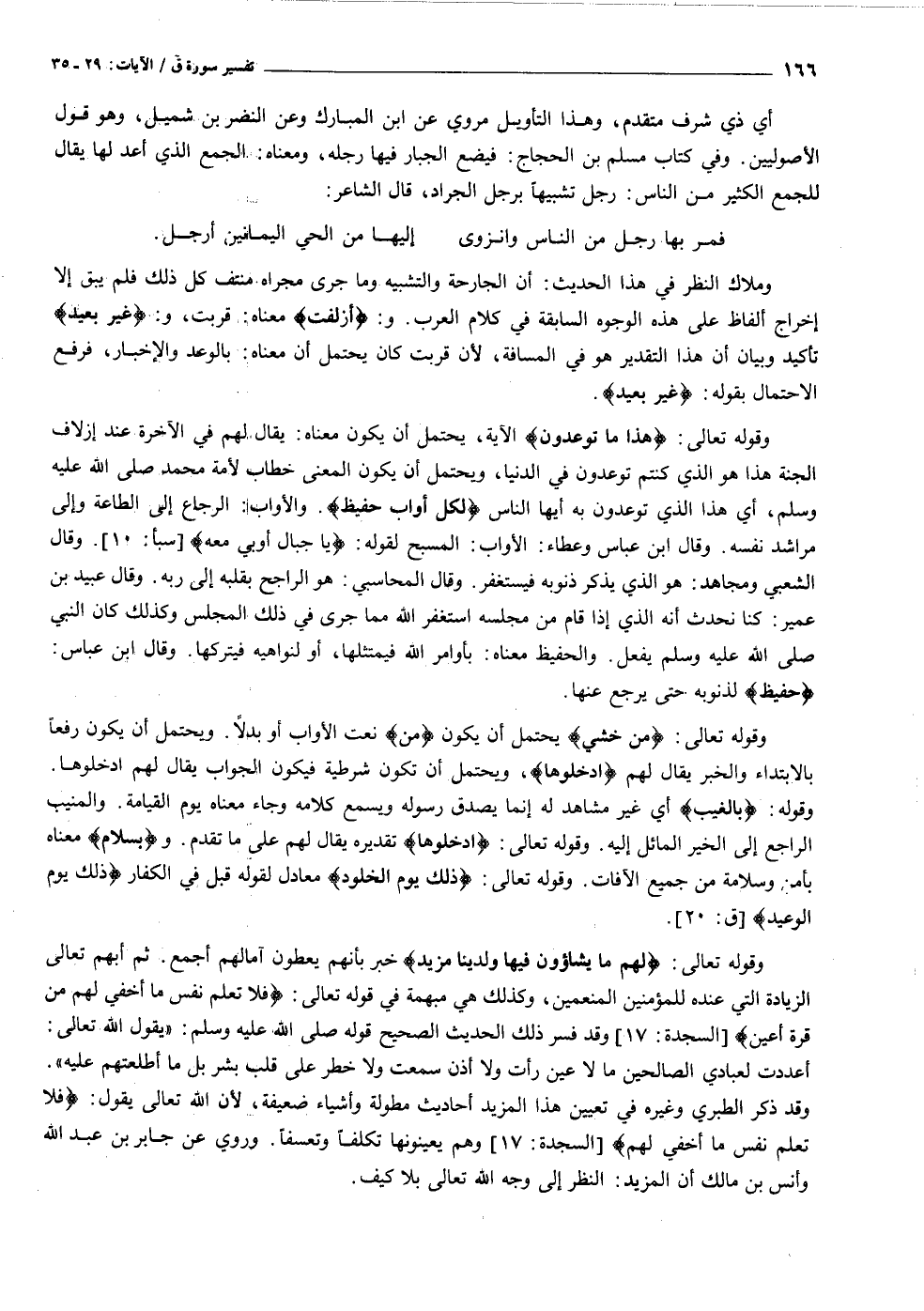 وملاك النظر في هذا الحديث: أن الجارحة والتشبيه وما جرى مجراه منتف كل ذلك فلم يبق إلا إخراج ألفاظ على هذه الوجوه السابقة في كلام العرب. و: أُزْلِفَتِ معناه: قربت، و: غَيْرَ بَعِيدٍ تأكيد وبيان أن هذا التقدير هو في المسافة، لأن قربت كان يحتمل أن معناه: بالوعد والإخبار، فرفع الاحتمال بقوله: غَيْرَ بَعِيدٍ.