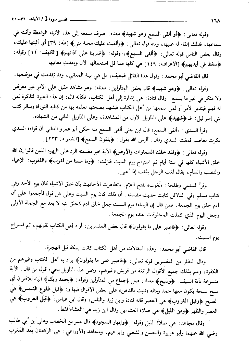 وقال النظار من المفسرين قوله تعالى: فَاصْبِرْ عَلى ما يَقُولُونَ يراد به أهل الكتاب وغيرهم من الكفرة، وعم بذلك جميع الأقوال الزائغة من قريش وغيرهم، وعلى هذا التأويل يجيء قول من قال: الآية منسوخة بآية السيف. وَسَبِّحْ معناه: صل بإجماع من المتأولين وقوله: بِحَمْدِ رَبِّكَ الباء للاقتران أي سبح سبحة يكون معها حمد ومثله «تنبت بالدهن» على بعض الأقوال فيها و: قَبْلَ طُلُوعِ الشَّمْسِ هي الصبح وَقَبْلَ الْغُرُوبِ هي العصر قاله قتادة وابن زيد والناس، وقال ابن عباس: قَبْلَ الْغُرُوبِ هي العصر والظهر وَمِنَ اللَّيْلِ هي صلاة العشاءين وقال ابن زيد هي العشاء فقط.