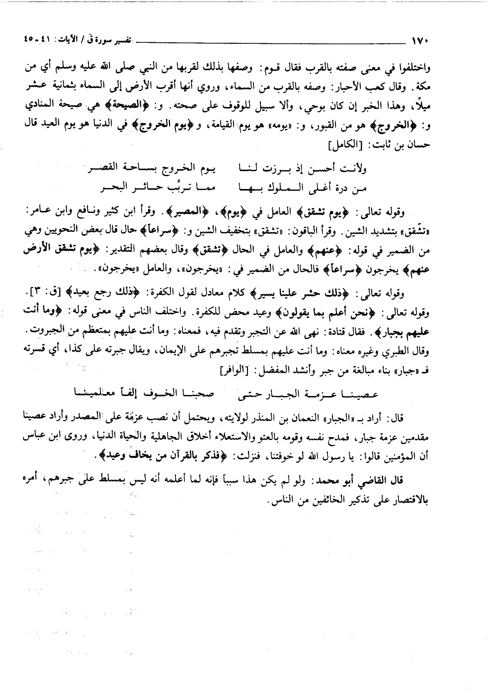 «تشّقق» بتشديد الشين. وقرأ الباقون: «تشقق» بتخفيف الشين و: سِراعاً حال قال بعض النحويين وهي من الضمير في قوله: عَنْهُمْ والعامل في الحال تَشَقَّقُ وقال بعضهم التقدير: يَوْمَ تَشَقَّقُ الْأَرْضُ عَنْهُمْ يخرجون سِراعاً فالحال من الضمير في: «يخرجون» ، والعامل «يخرجون» .