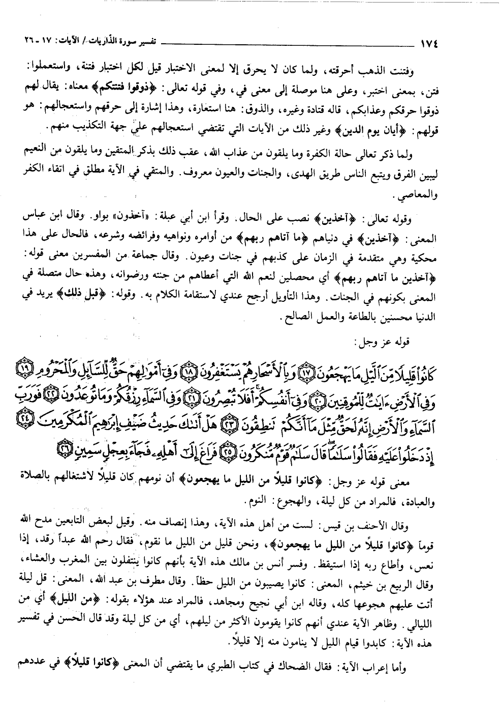 كانُوا قَلِيلاً مِنَ اللَّيْلِ ما يَهْجَعُونَ (١٧) وَبِالْأَسْحارِ هُمْ يَسْتَغْفِرُونَ (١٨) وَفِي أَمْوالِهِمْ حَقٌّ لِلسَّائِلِ وَالْمَحْرُومِ (١٩) وَفِي الْأَرْضِ آياتٌ لِلْمُوقِنِينَ (٢٠) وَفِي أَنْفُسِكُمْ أَفَلا تُبْصِرُونَ (٢١)
