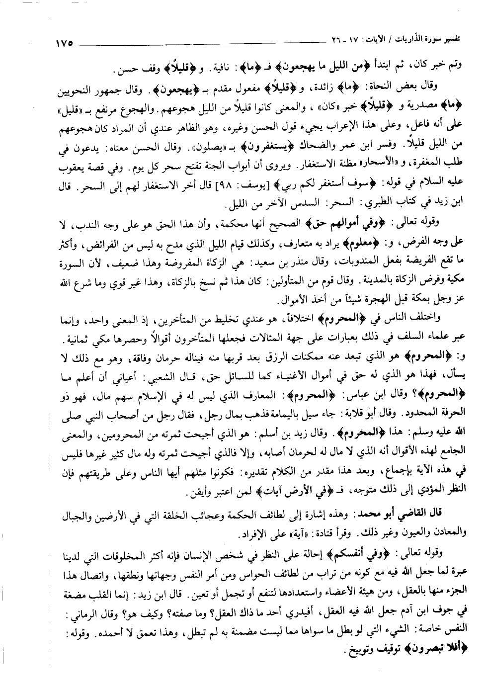 و: الْمَحْرُومِ هو الذي تبعد عنه ممكنات الرزق بعد قربها منه فيناله حرمان وفاقة، وهو مع ذلك لا يسأل، فهذا هو الذي له حق في أموال الأغنياء كما للسائل حق، قال الشعبي: أعياني أن أعلم ما الْمَحْرُومِ؟ وقال ابن عباس: الْمَحْرُومِ: المعارف الذي ليس له في الإسلام سهم مال، فهو ذو الحرفة المحدود. وقال أبو قلابة: جاء سيل باليمامة فذهب بمال رجل، فقال رجل من أصحاب النبي صلى الله عليه وسلم: هذا الْمَحْرُومِ. وقال زيد بن أسلم: هو الذي أجيحت ثمرته من المحرومين، والمعنى الجامع لهذه الأقوال أنه الذي لا مال له لحرمان أصابه، وإلا فالذي أجيحت ثمرته وله مال كثير غيرها فليس في هذه الآية بإجماع، وبعد هذا مقدر من الكلام تقديره: فكونوا مثلهم أيها الناس وعلى طريقتهم فإن النظر المؤدي إلى ذلك متوجه، ف فِي الْأَرْضِ آياتٌ لمن اعتبر وأيقن.