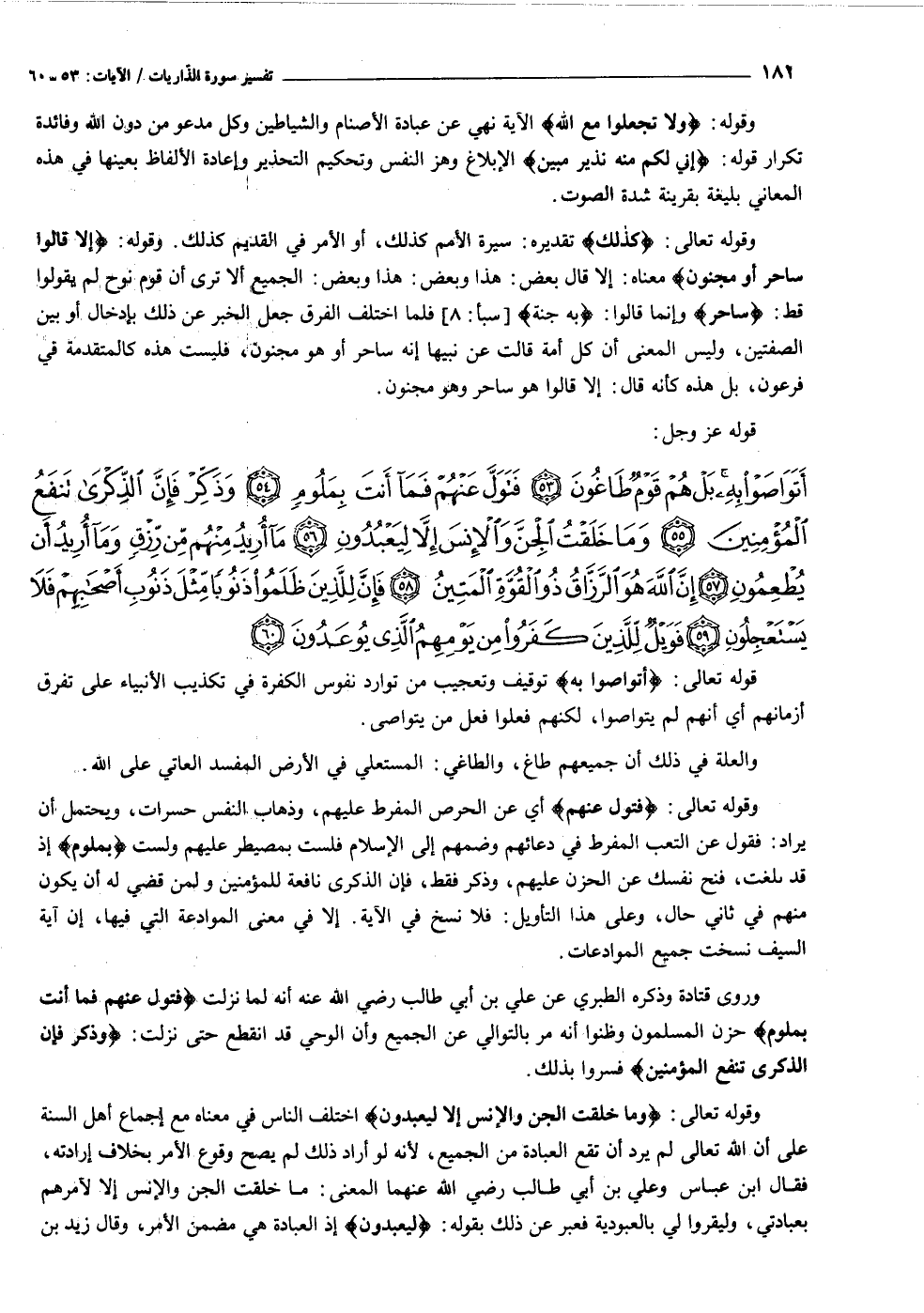 أَتَواصَوْا بِهِ بَلْ هُمْ قَوْمٌ طاغُونَ (٥٣) فَتَوَلَّ عَنْهُمْ فَما أَنْتَ بِمَلُومٍ (٥٤) وَذَكِّرْ فَإِنَّ الذِّكْرى تَنْفَعُ الْمُؤْمِنِينَ (٥٥) وَما خَلَقْتُ الْجِنَّ وَالْإِنْسَ إِلاَّ لِيَعْبُدُونِ (٥٦) ما أُرِيدُ مِنْهُمْ مِنْ رِزْقٍ وَما أُرِيدُ أَنْ يُطْعِمُونِ (٥٧)