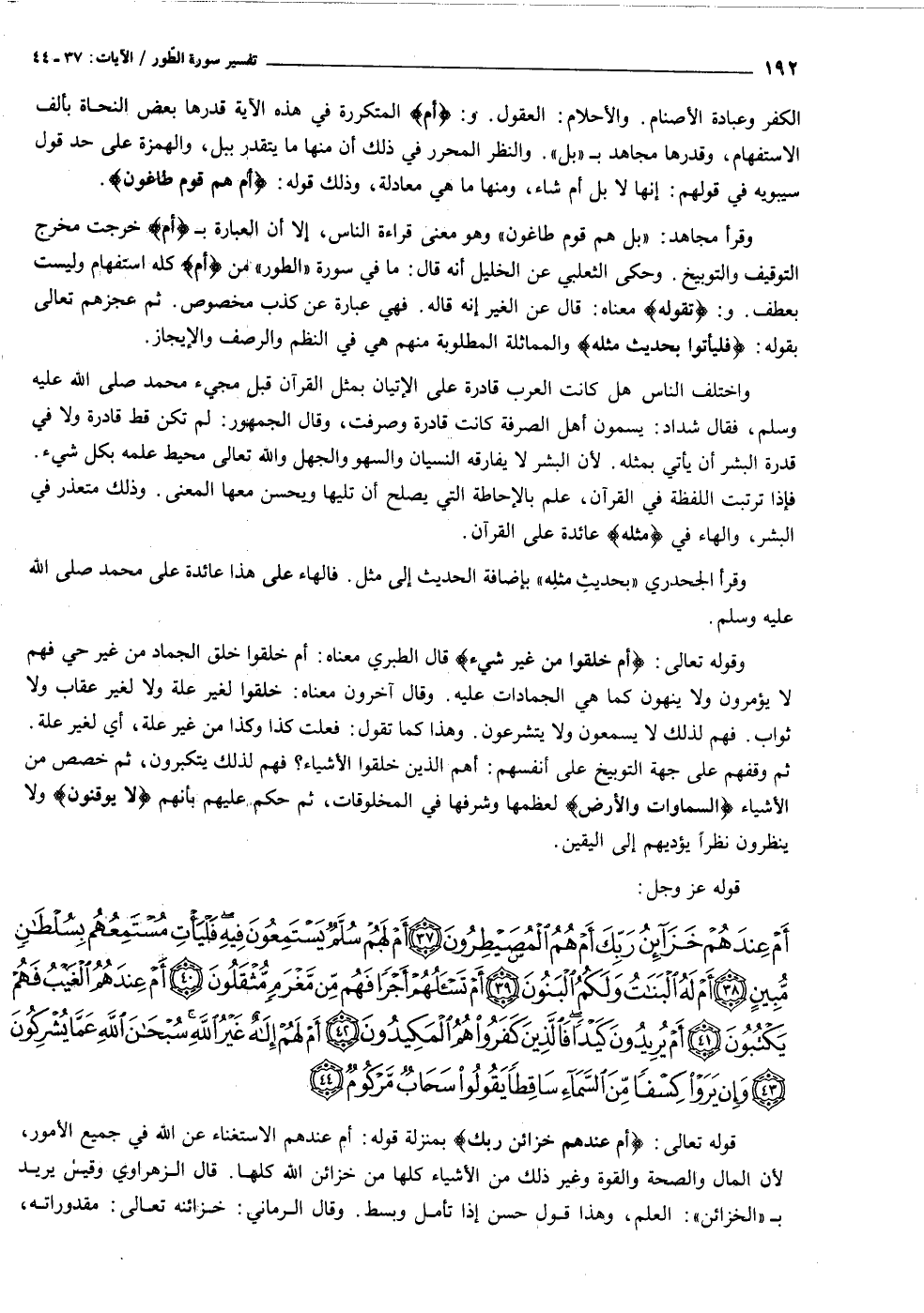 أَمْ عِنْدَهُمْ خَزائِنُ رَبِّكَ أَمْ هُمُ الْمُصَيْطِرُونَ (٣٧) أَمْ لَهُمْ سُلَّمٌ يَسْتَمِعُونَ فِيهِ فَلْيَأْتِ مُسْتَمِعُهُمْ بِسُلْطانٍ مُبِينٍ (٣٨) أَمْ لَهُ الْبَناتُ وَلَكُمُ الْبَنُونَ (٣٩) أَمْ تَسْئَلُهُمْ أَجْراً فَهُمْ مِنْ مَغْرَمٍ مُثْقَلُونَ (٤٠) أَمْ عِنْدَهُمُ الْغَيْبُ فَهُمْ يَكْتُبُونَ (٤١)