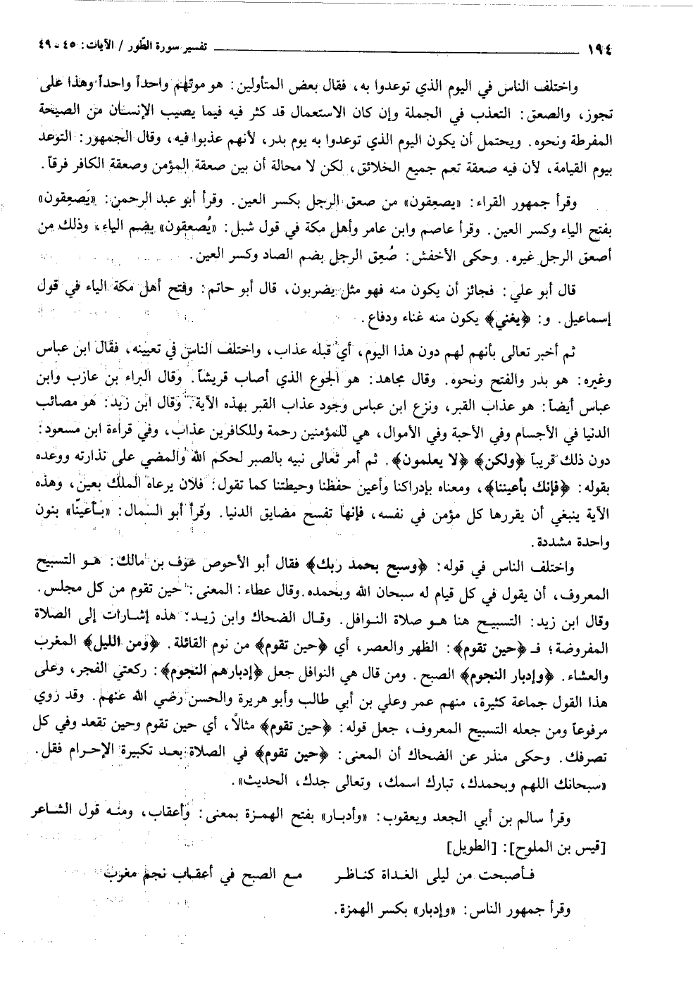 وقال ابن زيد: التسبيح هنا هو صلاة النوافل. وقال الضحاك وابن زيد: هذه إشارات إلى الصلاة المفروضة ف حِينَ تَقُومُ: الظهر والعصر، أي حِينَ تَقُومُ من نوم القائلة. وَمِنَ اللَّيْلِ المغرب والعشاء. وَإِدْبارَ النُّجُومِ الصبح. ومن قال هي النوافل جعل إدبارهم النُّجُومِ: ركعتي الفجر، وعلى هذا القول جماعة كثيرة، منهم عمر وعلي بن أبي طالب وأبو هريرة والحسن رضي الله عنهم. وقد روي مرفوعا ومن جعله التسبيح المعروف، جعل قوله: حِينَ تَقُومُ مثالا، أي حين تقوم وحين تقعد وفي كل تصرفك. وحكى منذر عن الضحاك أن المعنى: حِينَ تَقُومُ في الصلاة بعد تكبيرة الإحرام فقل.