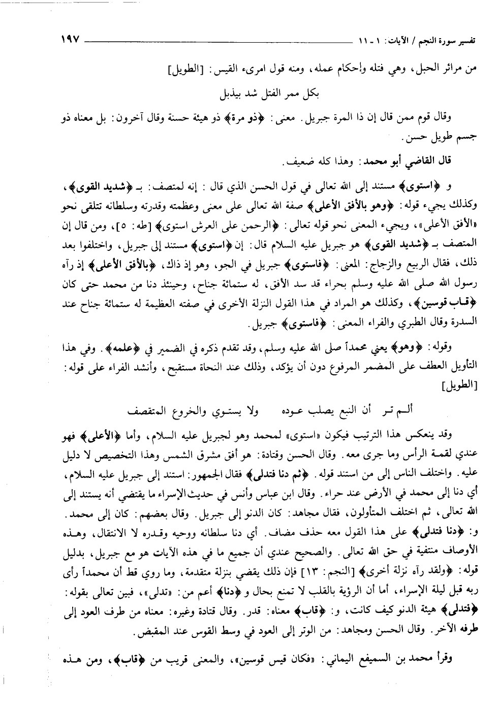 و (استوى) مستند إلى الله تعالى في قول الحسن الذي قال: إنه لمتصف: ب شَدِيدُ الْقُوى، وكذلك يجيء قوله: وَهُوَ بِالْأُفُقِ الْأَعْلى صفة الله تعالى على معنى وعظمته وقدرته وسلطانه تتلقى نحو «الأفق الأعلى» ، ويجيء المعنى نحو قوله تعالى: الرَّحْمنُ عَلَى الْعَرْشِ اسْتَوى [طه: ٥] ، ومن قال إن المتصف ب شَدِيدُ الْقُوى هو جبريل عليه السلام قال: إن (استوى) مستند إلى جبريل، واختلفوا بعد ذلك، فقال الربيع والزجاج: المعنى: فَاسْتَوى جبريل في الجو، وهو إذ ذاك، بِالْأُفُقِ الْأَعْلى إذ رآه رسول الله صلى الله عليه وسلم بحراء قد سد الأفق، له ستمائة جناح، وحينئذ دنا من محمد حتى كان قابَ قَوْسَيْنِ، وكذلك هو المراد في هذا القول النزلة الأخرى في صفته العظيمة له ستمائة جناح عند السدرة وقال الطبري والفراء المعنى: فَاسْتَوى جبريل.