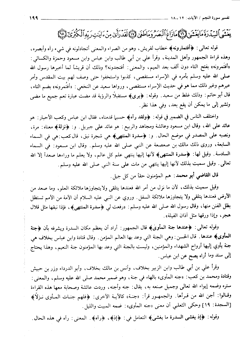 واختلف الناس في الضمير في قوله: وَلَقَدْ رَآهُ حسبما قدمناه، فقال ابن عباس وكعب الأحبار: هو عائد على الله، وقال ابن مسعود وعائشة ومجاهد والربيع: هو عائد على جبريل. و: نَزْلَةً معناه: مرة، ونصبه على المصدر في موضع الحال. و: سِدْرَةِ الْمُنْتَهى هي شجرة نبق، قال كعب: هي في السماء السابعة، وروى ذلك مالك بن صعصعة عن النبي صلى الله عليه وسلم. وقال ابن مسعود: في السماء السادسة. وقيل لها: سِدْرَةِ الْمُنْتَهى لأنها إليها ينتهي علم كل عالم، ولا يعلم ما وراءها صعدا إلا الله تعالى. وقيل سميت بذلك لأنها إليها ينتهي من مات على سنة النبي صلى الله عليه وسلم.