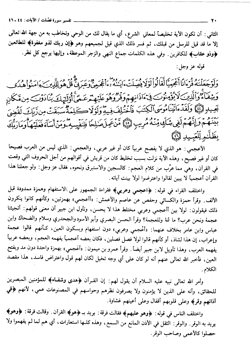 وَلَوْ جَعَلْناهُ قُرْآناً أَعْجَمِيًّا لَقالُوا لَوْلا فُصِّلَتْ آياتُهُءَ أَعْجَمِيٌّ وَعَرَبِيٌّ قُلْ هُوَ لِلَّذِينَ آمَنُوا هُدىً وَشِفاءٌ وَالَّذِينَ لا يُؤْمِنُونَ فِي آذانِهِمْ وَقْرٌ وَهُوَ عَلَيْهِمْ عَمًى أُولئِكَ يُنادَوْنَ مِنْ مَكانٍ بَعِيدٍ (٤٤) وَلَقَدْ آتَيْنا مُوسَى الْكِتابَ فَاخْتُلِفَ فِيهِ وَلَوْلا كَلِمَةٌ سَبَقَتْ مِنْ رَبِّكَ لَقُضِيَ بَيْنَهُمْ وَإِنَّهُمْ لَفِي شَكٍّ مِنْهُ مُرِيبٍ (٤٥) مَنْ عَمِلَ صالِحاً فَلِنَفْسِهِ وَمَنْ أَساءَ فَعَلَيْها وَما رَبُّكَ بِظَلاَّمٍ لِلْعَبِيدِ (٤٦)