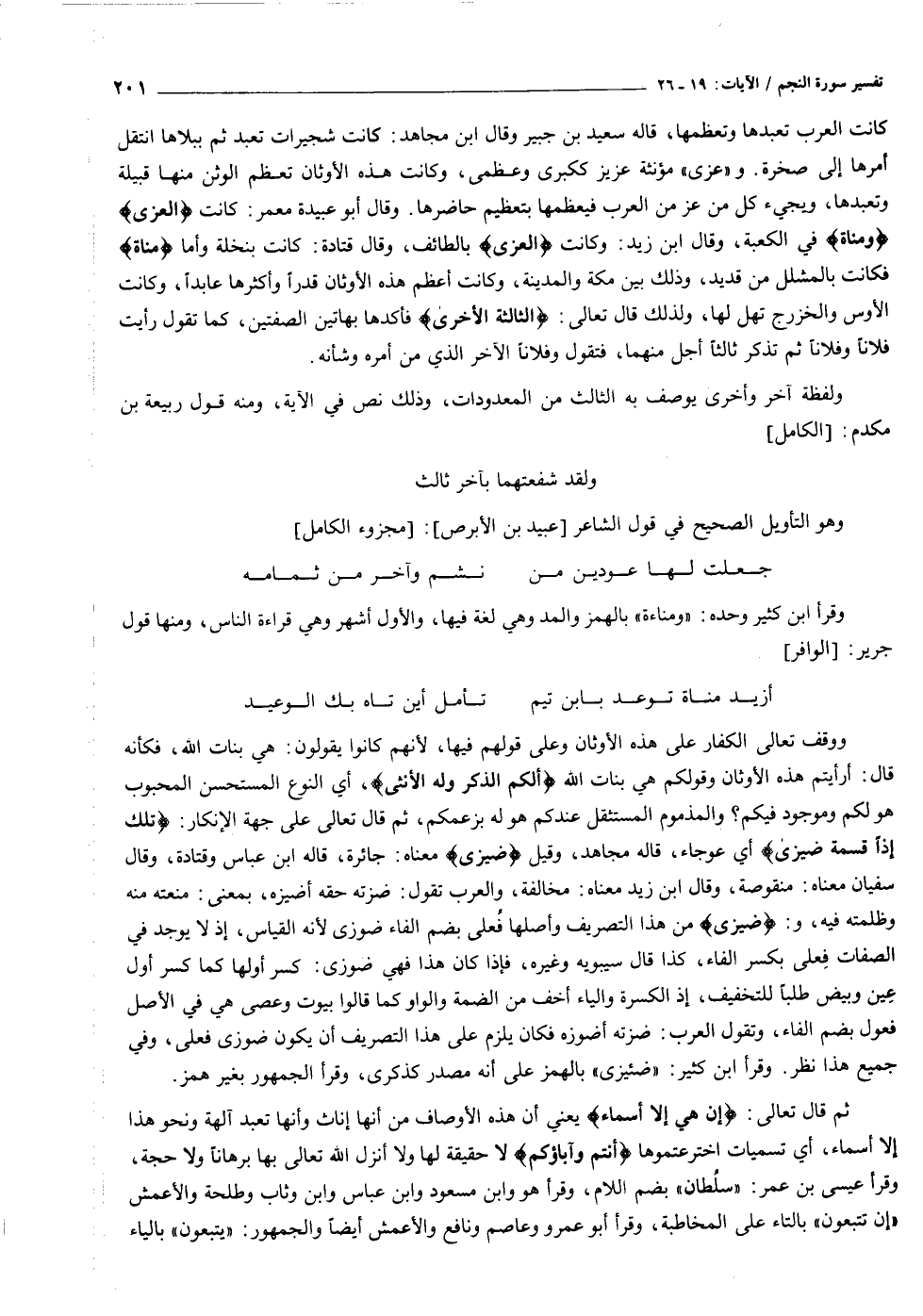 كانت العرب تعبدها وتعظمها، قاله سعيد بن جبير وقال ابن مجاهد: كانت شجيرات تعبد ثم ببلاها انتقل أمرها إلى صخرة. و «عزى» مؤنثة عزيز ككبرى وعظمى، وكانت هذه الأوثان تعظم الوثن منها قبيلة وتعبدها، ويجيء كل من عز من العرب فيعظمها بتعظيم حاضرها. وقال أبو عبيدة معمر: كانت الْعُزَّى وَمَناةَ في الكعبة، وقال ابن زيد: وكانت الْعُزَّى بالطائف، وقال قتادة: كانت بنخلة وأما مَناةَ فكانت بالمشلل من قديد، وذلك بين مكة والمدينة، وكانت أعظم هذه الأوثان قدرا وأكثرها عابدا، وكانت الأوس والخزرج تهل لها، ولذلك قال تعالى: الثَّالِثَةَ الْأُخْرى فأكدها بهاتين الصفتين، كما تقول رأيت فلانا وفلانا ثم تذكر ثالثا أجل منهما، فتقول وفلانا الآخر الذي من أمره وشأنه.