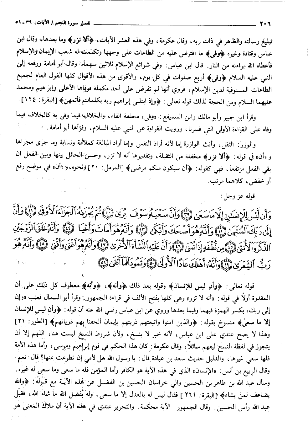 قوله تعالى: وَأَنْ لَيْسَ لِلْإِنْسانِ وقوله بعد ذلك وَأَنَّهُ، وَأَنَّهُ معطوف كل ذلك على أن المقدرة أولا في قوله: «أنه لا تزر» وهي كلها بفتح الألف في قراءة الجمهور. وقرأ أبو السمال قعنب «وإن إلى ربك» بكسر الهمزة فيهما وفيما بعدها وروي عن ابن عباس رضي الله عنه أن قوله: وَأَنْ لَيْسَ لِلْإِنْسانِ إِلَّا ما سَعى منسوخ بقوله: وَالَّذِينَ آمَنُوا وَاتَّبَعَتْهُمْ ذُرِّيَّتُهُمْ بِإِيمانٍ أَلْحَقْنا بِهِمْ ذُرِّيَّتَهُمْ [الطور: ٢١] وهذا لا يصح عندي على ابن عباس، لأنه خبر لا ينسخ، ولأن شروط النسخ ليست هنا، اللهم إلا أن يتجوز في لفظة النسخ ليفهم سائلا، وقال عكرمة: كان هذا الحكم في قوم إبراهيم وموسى، وأما هذه الأمة فلها سعي غيرها، والدليل حديث سعد بن عبادة قال: يا رسول الله هل لأمي إن تطوعت عنها؟ قال: نعم.