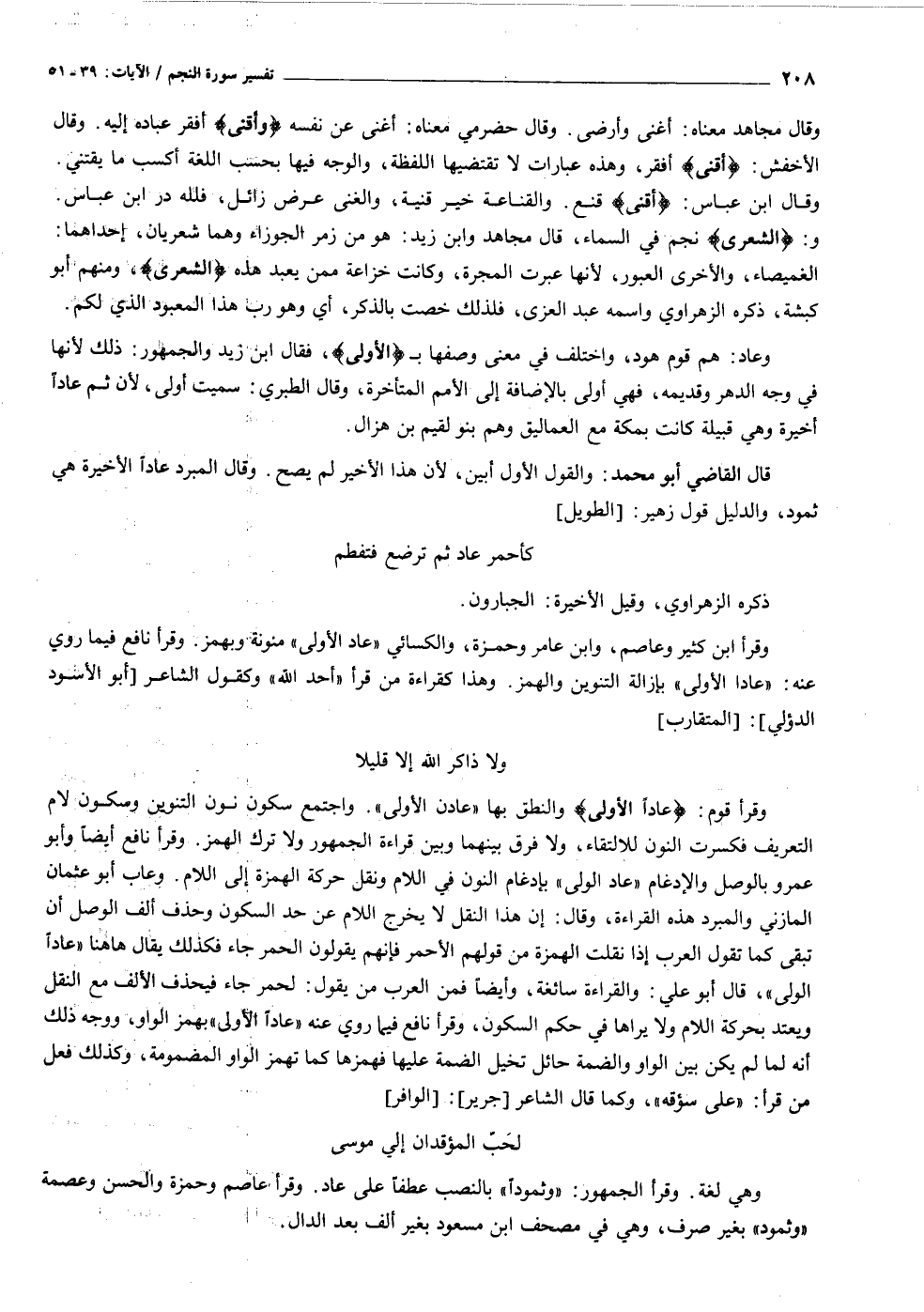 وقرأ ابن كثير وعاصم، وابن عامر وحمزة، والكسائي «عاد الأولى» منونة وبهمز. وقرأ نافع فيما روي عنه: «عادا الأولى» بإزالة التنوين والهمز. وهذا كقراءة من قرأ «أحد الله» وكقول الشاعر [أبو الأسود الدؤلي] : [المتقارب] ولا ذاكر الله إلا قليلا وقرأ قوم: عاداً الْأُولى والنطق بها «عادن الأولى» . واجتمع سكون نون التنوين وسكون لام التعريف فكسرت النون للالتقاء، ولا فرق بينهما وبين قراءة الجمهور ولا ترك الهمز. وقرأ نافع أيضا وأبو عمرو بالوصل والإدغام «عاد الولي» بإدغام النون في اللام ونقل حركة الهمزة إلى اللام. وعاب أبو عثمان المازني والمبرد هذه القراءة، وقال: إن هذا النقل لا يخرج اللام عن حد السكون وحذف ألف الوصل أن تبقى كما تقول العرب إذا نقلت الهمزة من قولهم الأحمر فإنهم يقولون الحمر جاء فكذلك يقال هاهنا «عادا الولي» ، قال أبو علي: والقراءة سائغة، وأيضا فمن العرب من يقول: لحمر جاء فيحذف الألف مع النقل ويعتد بحركة اللام ولا يراها في حكم السكون، وقرأ نافع فيما روي عنه «عادا الأولى» بهمز الواو، ووجه ذلك أنه لما لم يكن بين الواو والضمة حائل تخيل الضمة عليها فهمزها كما تهمز الواو المضمومة، وكذلك فعل من قرأ: «على سؤقه» ، وكما قال الشاعر [جرير] : [الوافر] لحبّ المؤقدان إلى موسى وهي لغة. وقرأ الجمهور: «وثمودا» بالنصب عطفا على عاد. وقرأ عاصم وحمزة والحسن وعصمة «وثمود» بغير صرف، وهي في مصحف ابن مسعود بغير ألف بعد الدال.
